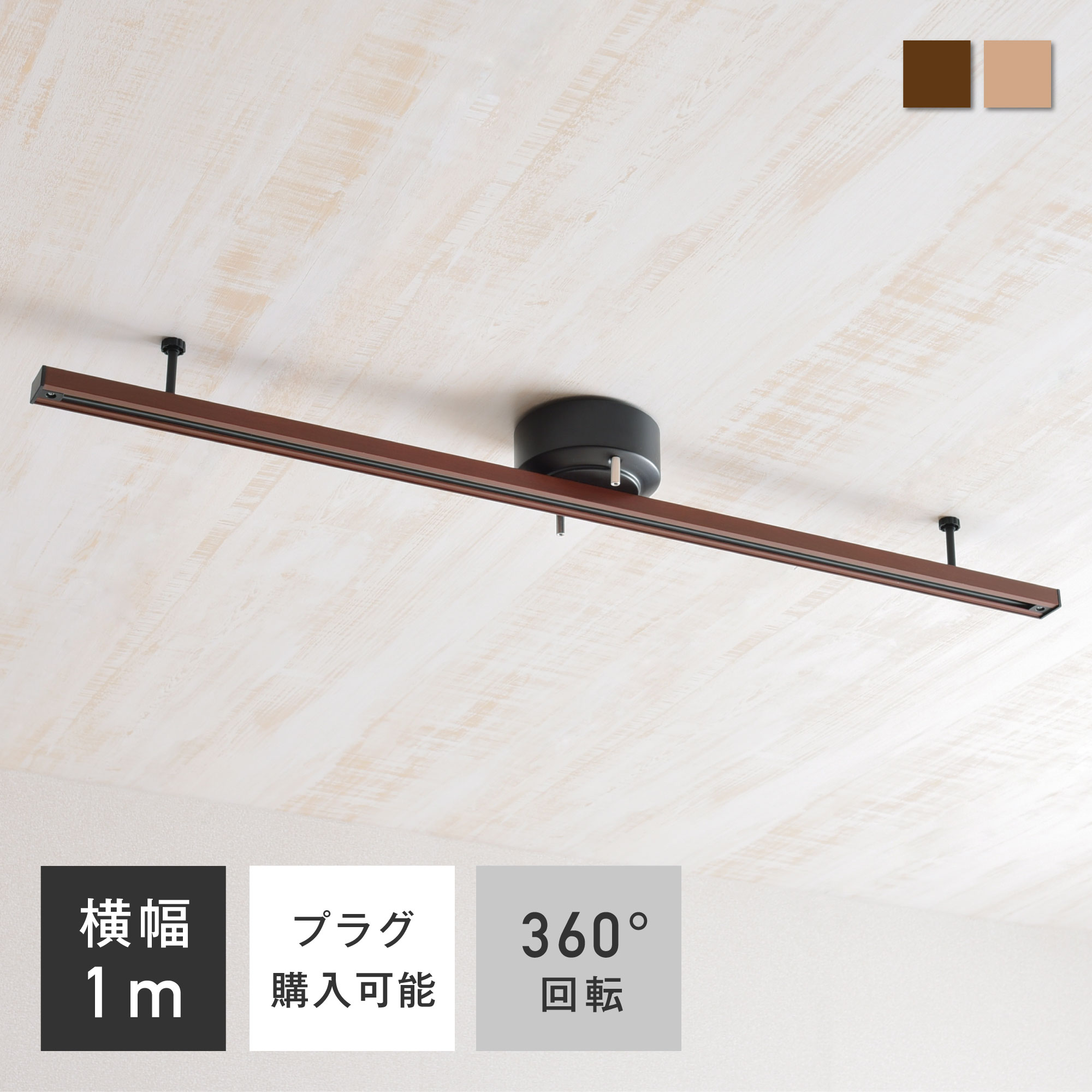 通常のダクトレールのようなライトがつけられない端の部分や中間部分の位置にもライトの移動ができ、1mと1.5mの2サイズ展開でお好みの長さをお選びいただけます。両サイドにアジャスターが付いており天井と固定しレールのバランスをキープできるためダクトレールの傾きを防ぎます。カラーはブラック/ホワイト/ナチュラル/ブラウンの4色で北欧テキスト、モダン、ナチュラルなどお部屋のテイストに合わせてお選びいただけます。ブラックとホワイトのカバー部分はマットな素材感でスタイリッシュなインテリアが好きな方におすすめのカラーです。ナチュラル/ブラウンは、木目のプリントを施しており落ち着いた優しいナチュラルでおしゃれな雰囲気が好きな方におすすめです。天井に取り付けた後も違う方向に照らしたい場合、レールの向きを回転することが可能です。向きを変更する際にわざわざ取り外ししなくても良いのでとても簡単です。天井に穴を開けずに設置ができるので電気工事が不要で簡単に取り付けることができます。また、本商品は取り付けの際のネジが2本のため設置がラクラクです。