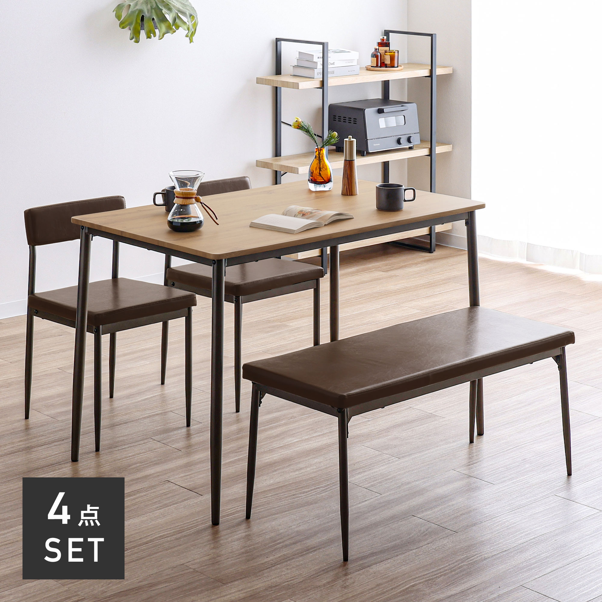 【すらりと真っ直ぐに伸びるスチール素材の脚部のスタイリッシュさ】×【天然木のような優しさを感じる木目調の天板】×【ヴィンテージ感溢れるレザー調のクッション】の3つが組み合わさった洗練されたシンプルなデザインが、毎日の暮らしを引き立てるカフェ風のダイニング。幅約110×奥行き約70cmのコンパクトなサイズ感でお部屋のスペースを取らずにダイニングテーブルの設置をしたい方におすすめ。ゆったり座れる広々座面のベンチ1脚、座り心地の良い座面クッション付きのチェア2脚、木目模様が美しいテーブルの4点セット。ダイニングテーブルとしてだけでなく、デスクとしても使用可能で、PC作業や読書などにも最適です。座面と背もたれのクッションはレザー調で、汚れても簡単に拭き取ることができ、メンテナンスが簡単です。 全体的に、洗練されたデザインと実用性が融合し、快適で居心地の良い空間を提供します。