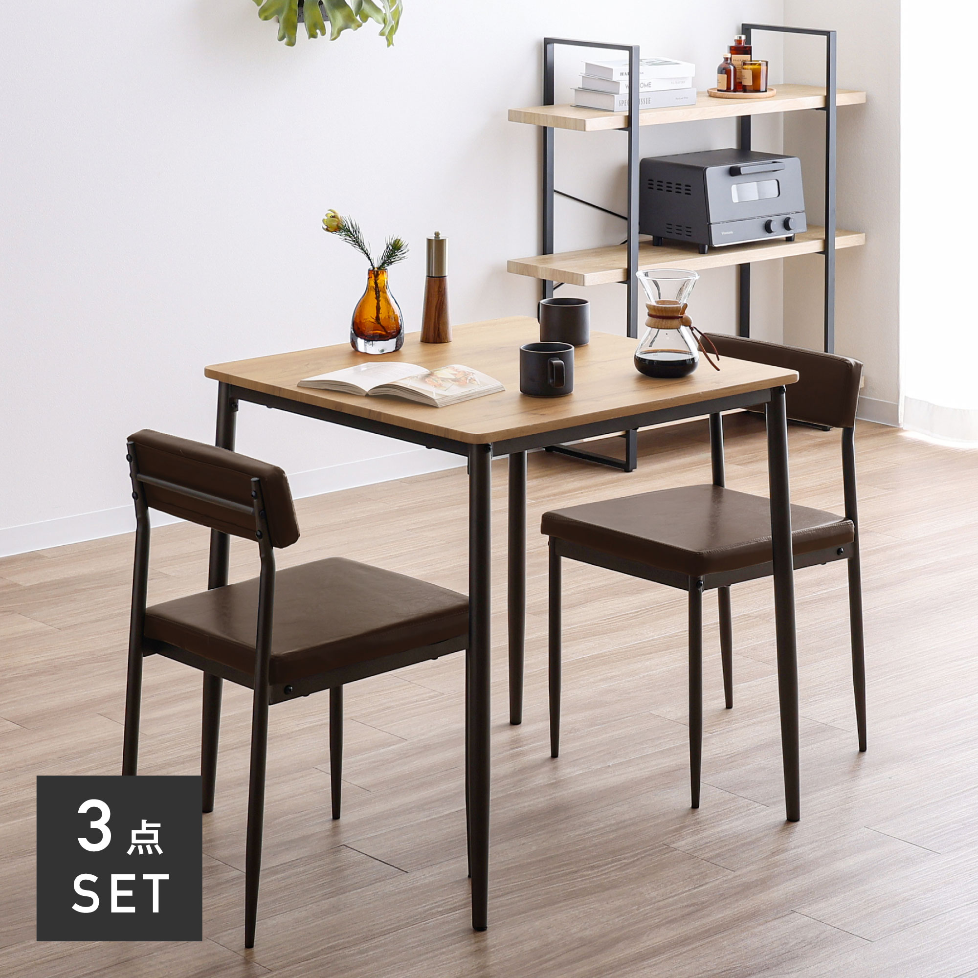 【すらりと真っ直ぐに伸びるスチール素材の脚部のスタイリッシュさ】×【天然木のような優しさを感じる木目調の天板】×【ヴィンテージ感溢れるレザー調のクッション】の3つが組み合わさった洗練されたシンプルなデザインが、毎日の暮らしを引き立てるカフェ風のダイニング。幅約70×奥行き約70cmのコンパクトなサイズ感でお部屋のスペースを取らずにダイニングテーブルの設置をしたい方におすすめ。座り心地の良い座面クッション付きのチェア2脚、木目模様が美しいテーブルの3点セット。ダイニングテーブルとしてだけでなく、デスクとしても使用可能で、PC作業や読書などにも最適です。座面と背もたれのクッションはレザー調で、汚れても簡単に拭き取ることができメンテナンスが簡単です。 洗練されたデザインと実用性が融合し、快適で居心地の良い空間を提供します。