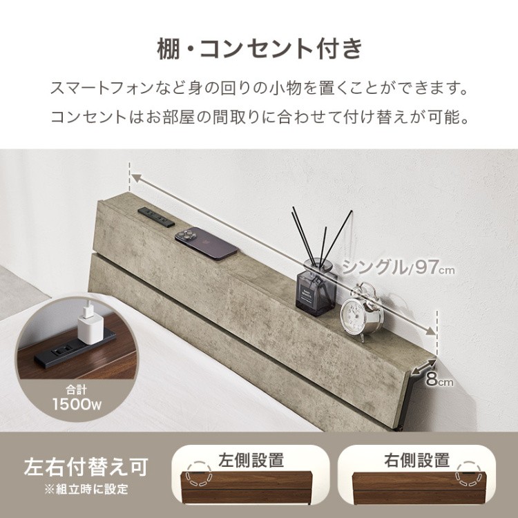 ロータイプ シングル ベッド ポケットコイル マットレス セット コンセント 木目調 ヘッドボード 宮 棚 収納 マット スチール フレーム 耐荷重300kg 送料無料