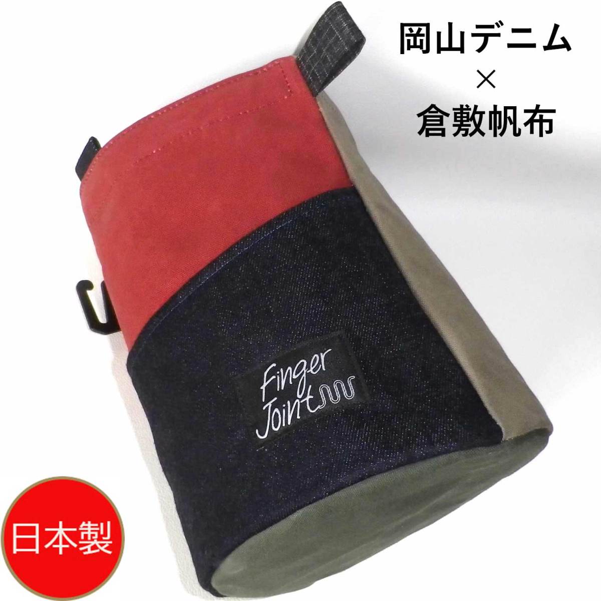 フィンガージョイント・ボルダリング置き型チョークバッグ / チョークバケットA-岡山デニム×パラフィン帆布(ワイン/グレー×黒織)