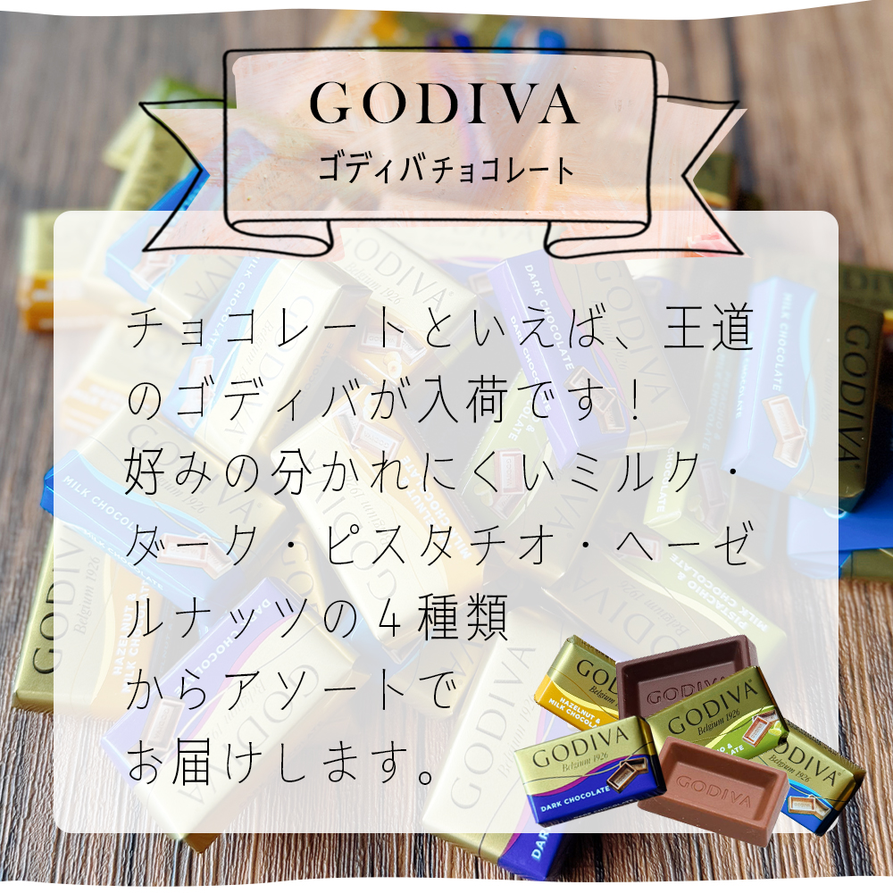 ※チョコレートの種類(ゴディバ・スイスデリスなど)はランダムでのアソートとなります。