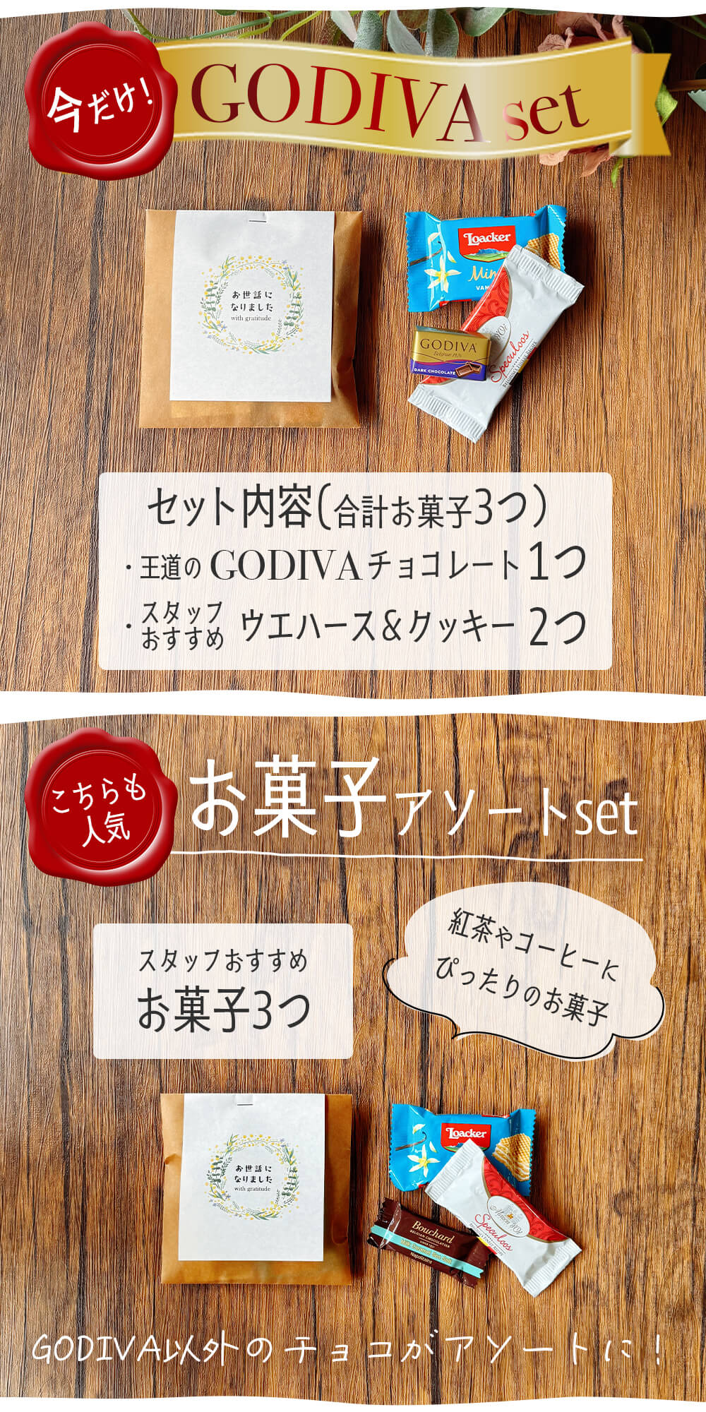 ■今だけGODIVAセット → GODIVAチョコレート1個 + スタッフおすすめお菓子2個