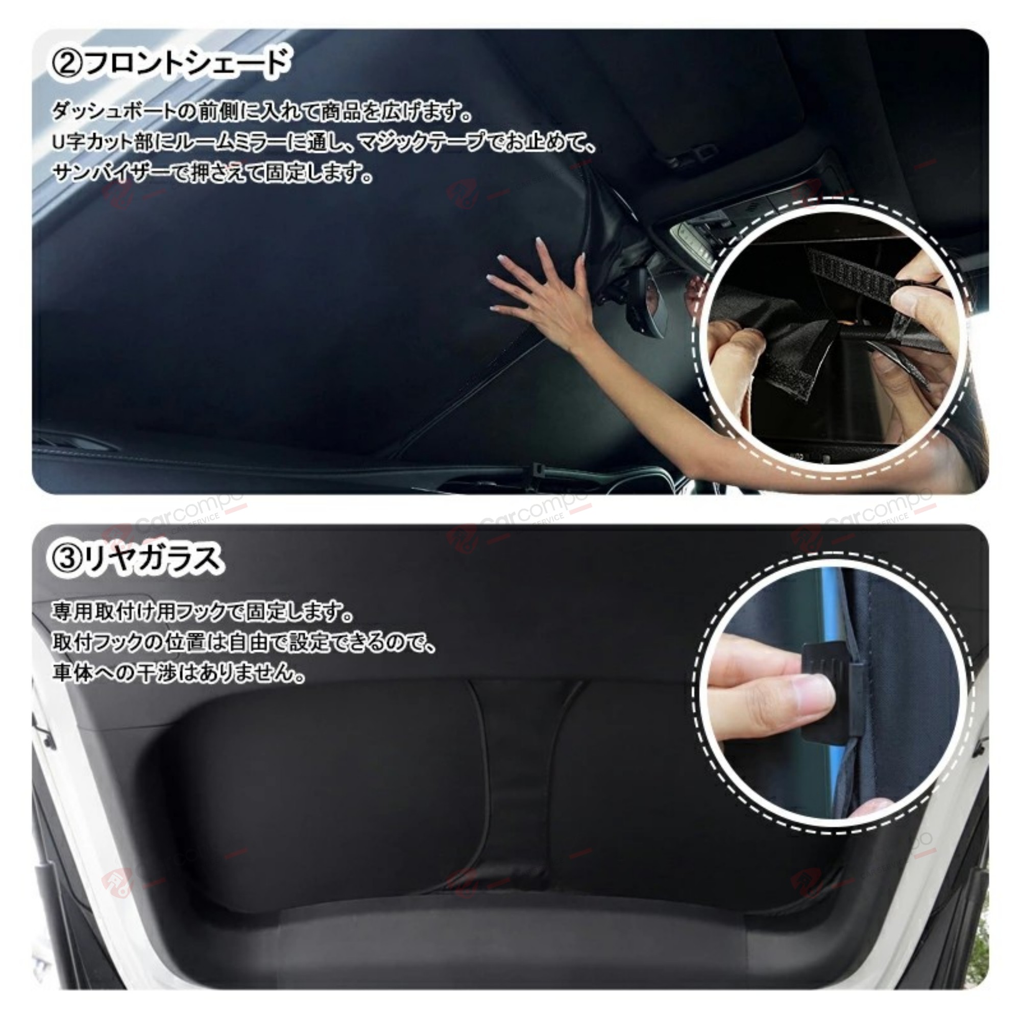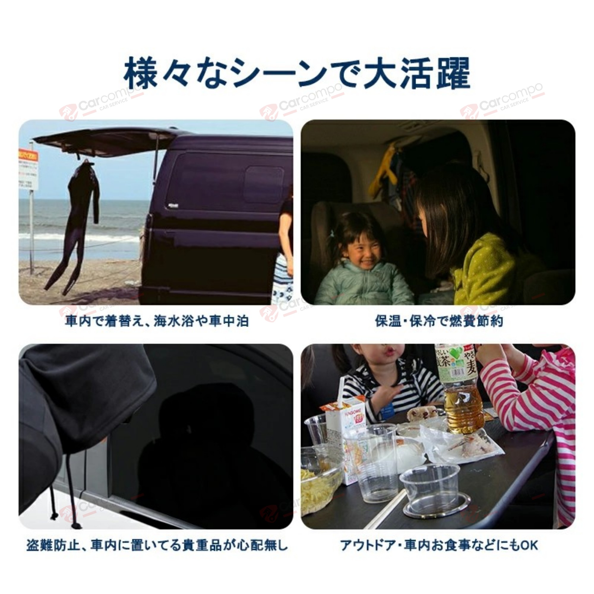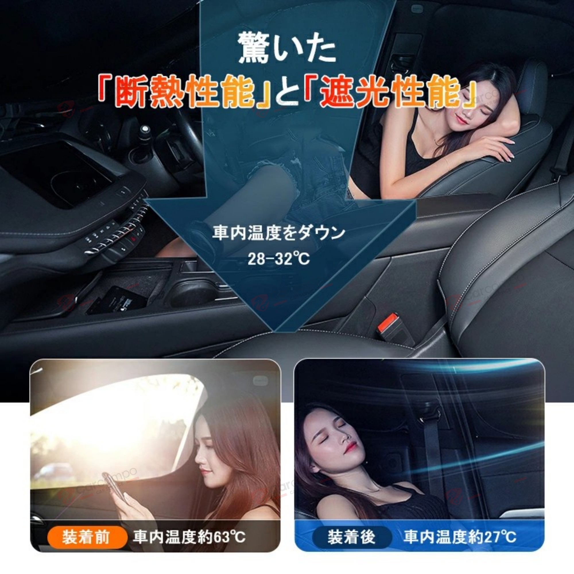 | 特徴2、日差し・視線をしっかりカット | 強い日差しや紫外線を遮断し、車内温度の上昇を防止。ダッシュボードやシートの劣化も軽減できます。外からの視線も遮るため、車中泊や着替えの際のプライバシー保護にも最適です。