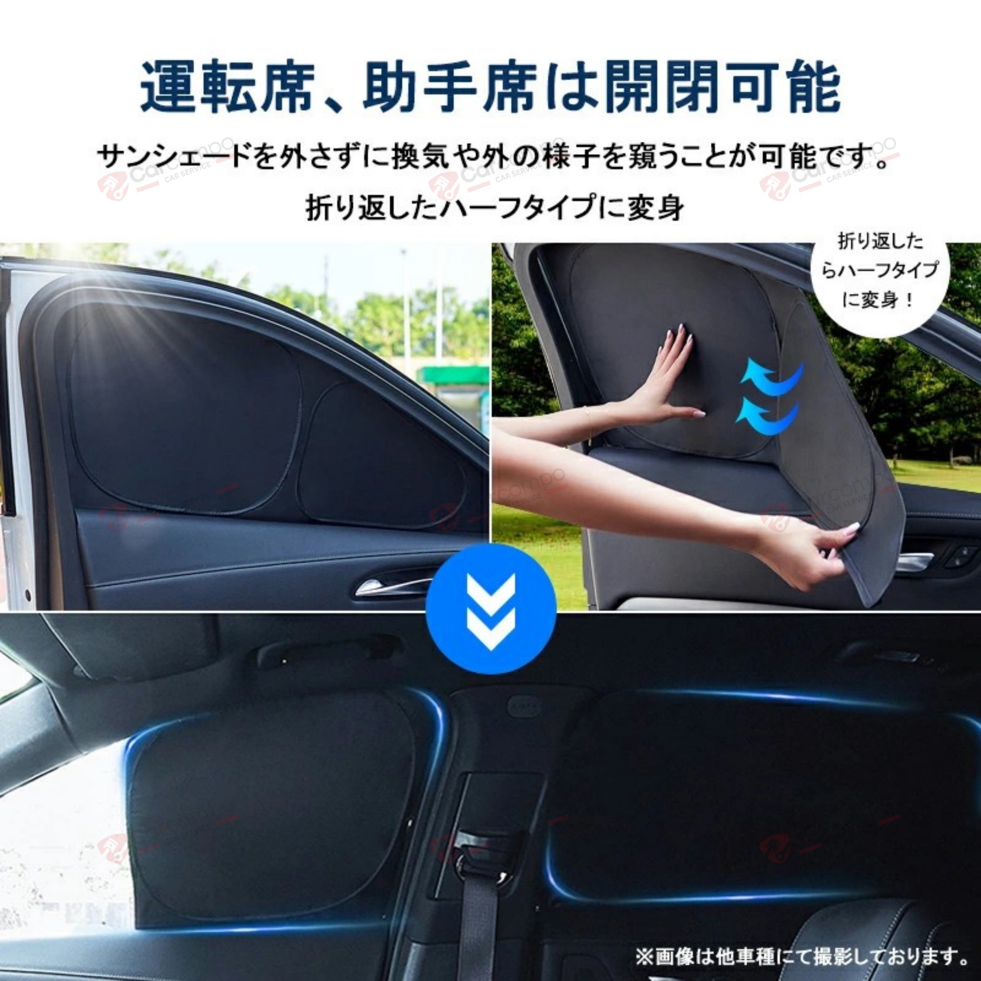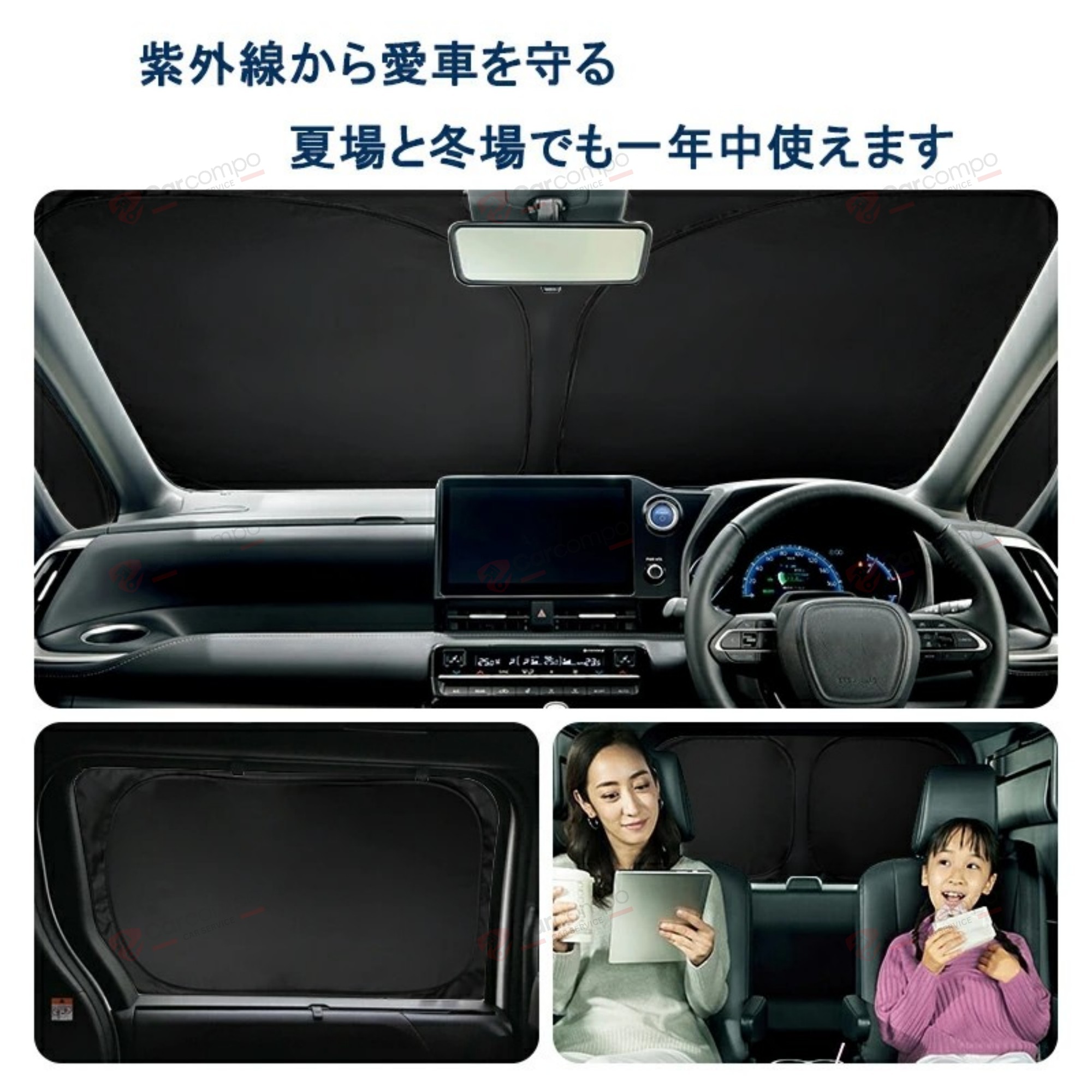 | 特徴3、車全体をしっかりカバー | フロントからリアまで車全体を覆える設計で、夏の直射日光からしっかりガード。肌の日焼け対策にも効果的です。