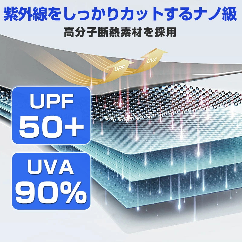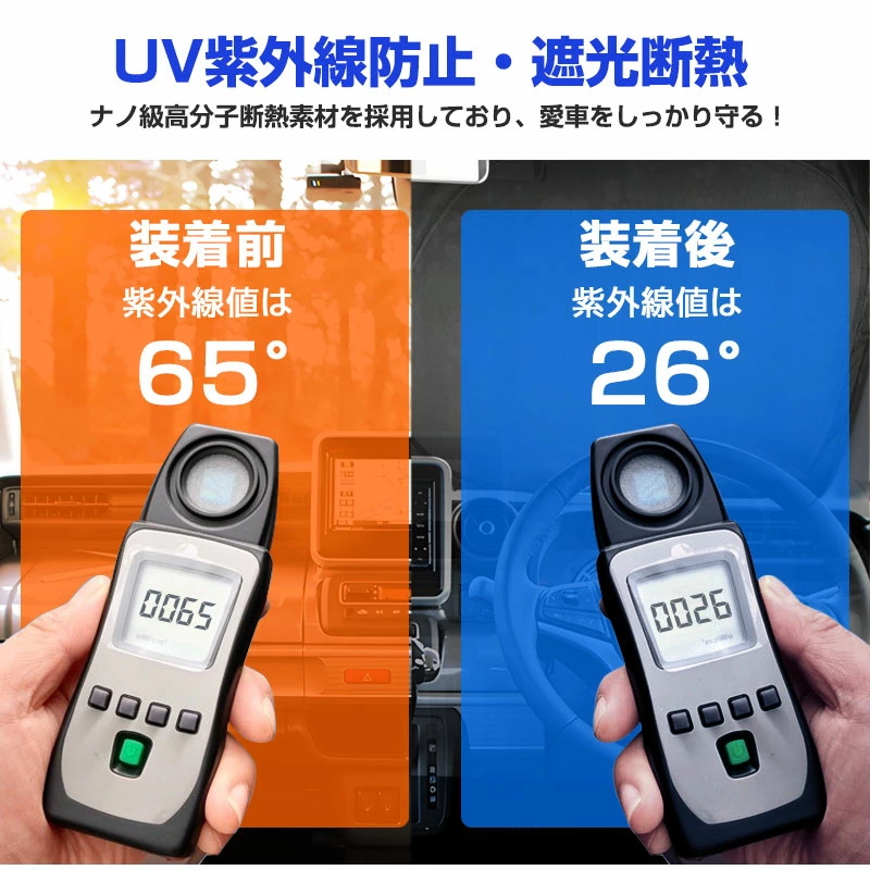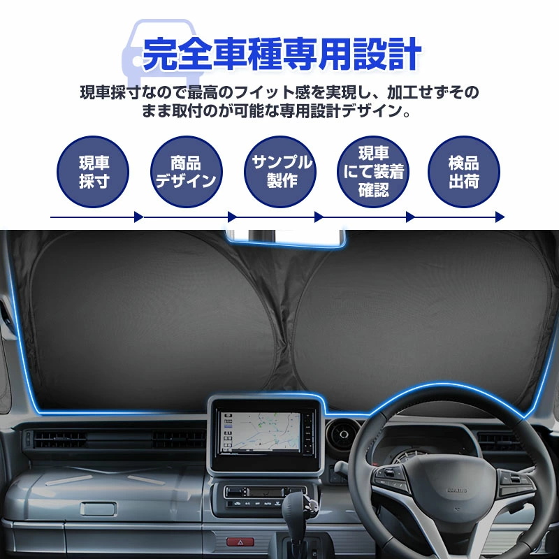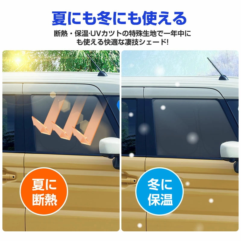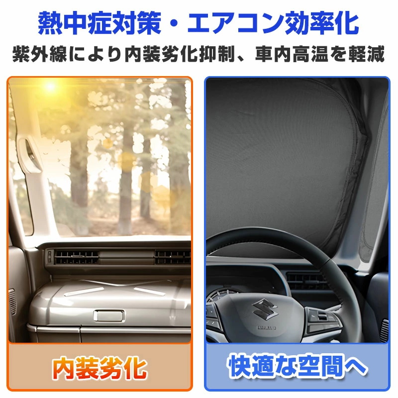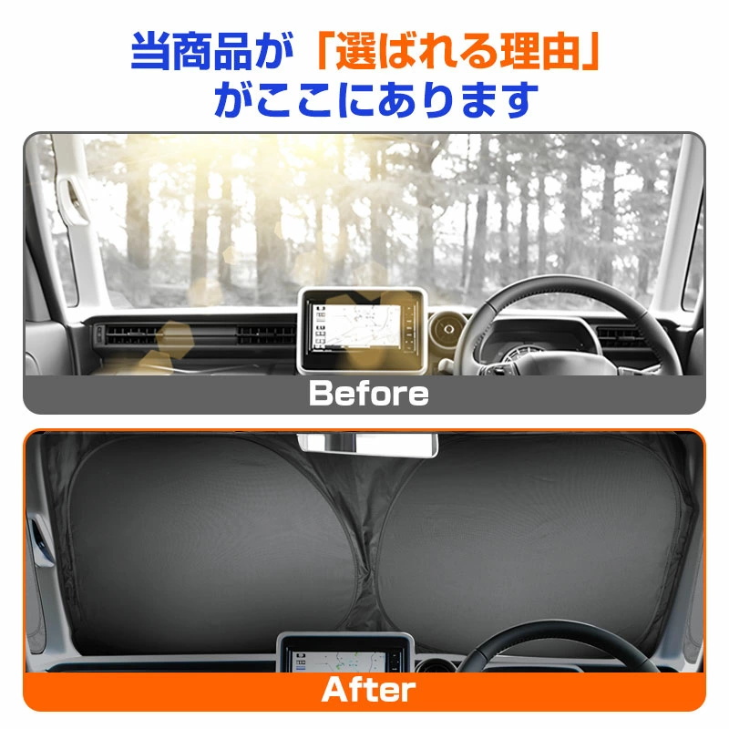 | 特徴2、日差し・視線をしっかりカット | 強い日差しや紫外線を遮断し、車内温度の上昇を防止。ダッシュボードやシートの劣化も軽減できます。外からの視線も遮るため、車中泊や着替えの際のプライバシー保護にも最適です。