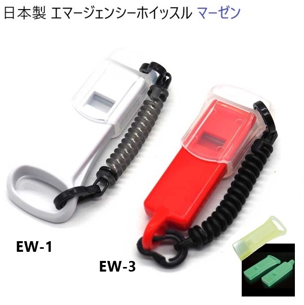 日本製 ホイッスル 光る 蓄光タイプ コイルストラップ/カバーキャップ付き EW-1 横長穴 薄型 エマージェンシーホイッスル 笛 マーゼン マーゼンプロダクツ