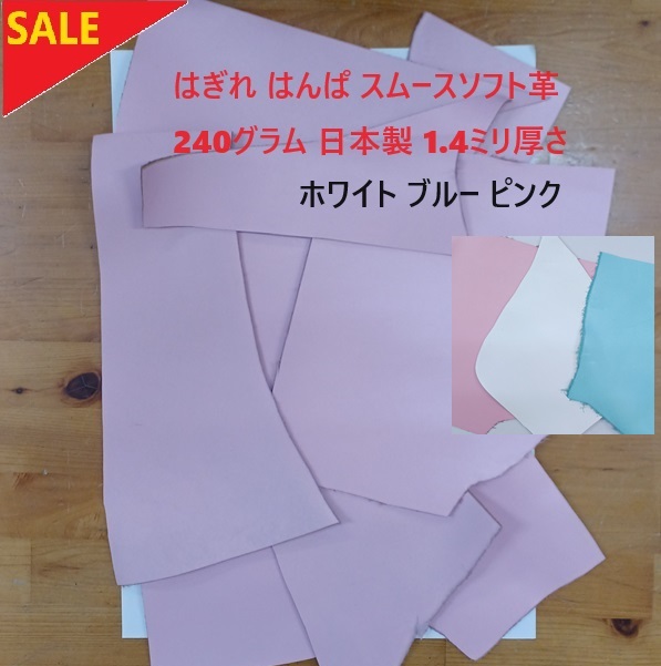 1.8倍に増量! 240グラム はぎれ はんぱ スムースソフト革 日本製 1.4ミリ厚さ -サービス品 裁断済み革- パステルホワイト パステルブルー パステルピンク