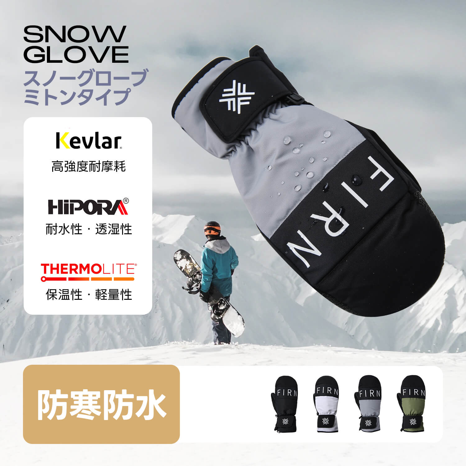スノーボード スキー ミトン グローブ ケブラー ハイポーラ 防水 メンズ レディース 保温 軽量 5本指インナー 紐付き firn フィルン
