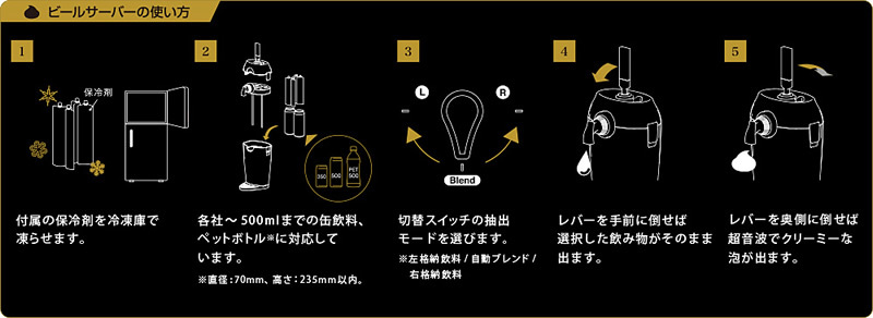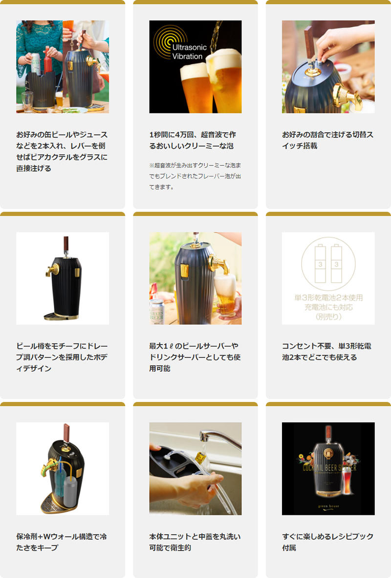 飲み物をお好みの割合でつくれる切替スイッチを搭載し、ビアホールで飲むようなきめ細かいクリーミーな泡と共に、自分だけのオリジナルブレンドのビアカクテルをご家庭で気軽に楽しめます。