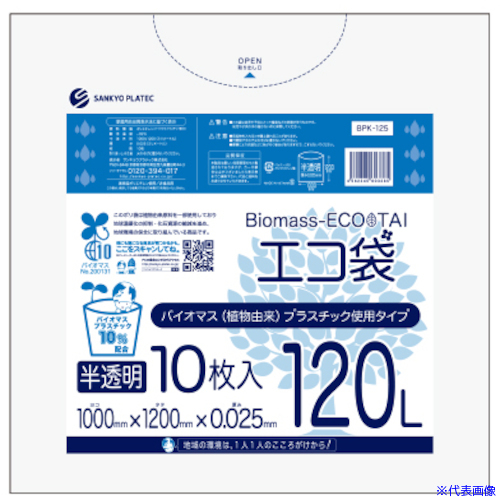 ■サンキョウプラ バイオマスプラスチック 10%配合エコ袋120L 10枚 0.025mm厚 半透明 BPK125(5275727)