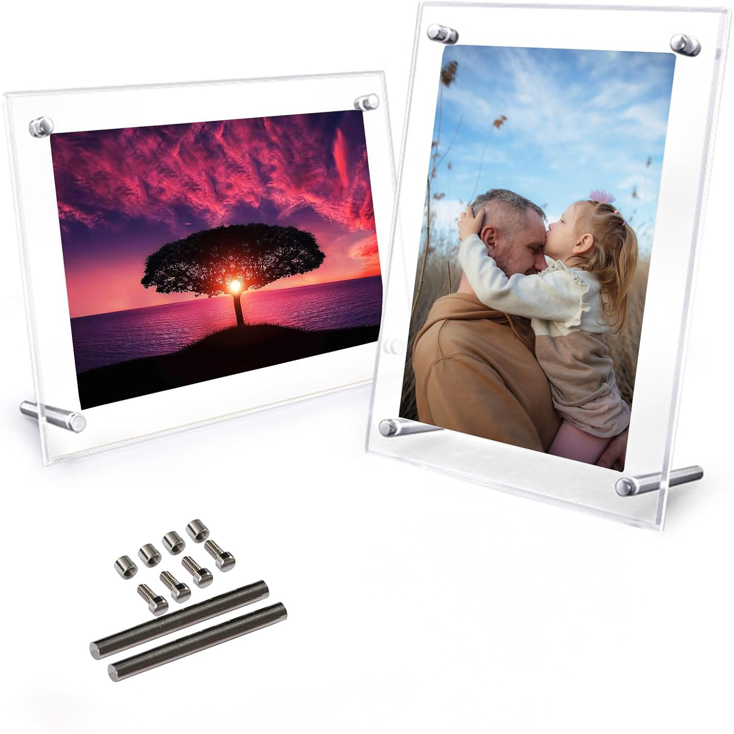1.フレームの外側の保護フィルムを剥がす、2.二枚アクリル板で写真を挟む、3.付属品ネジで二枚アクリル板を止める。