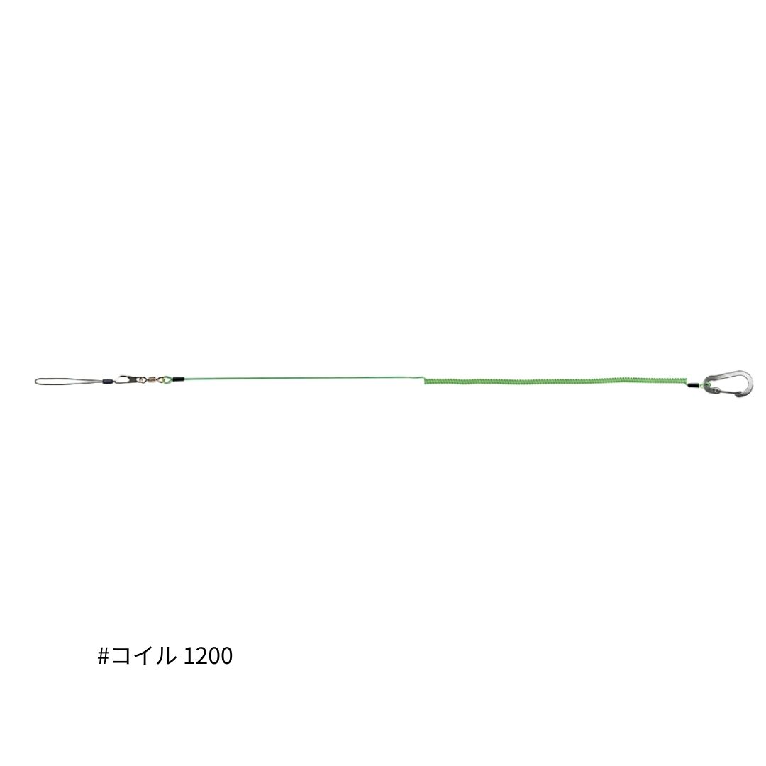 最大使用全長(mm):1200 最大強度(kg):15 材質:ウレタン+ポリアミド繊維 ロープ形状:コイルロープ 接続部(固定側):アルミカラビナ 接続部(タックル側):スナップ・ループコード最大伸長1200mm。鮎ダモやアクセサリーなどに。強度15kg。