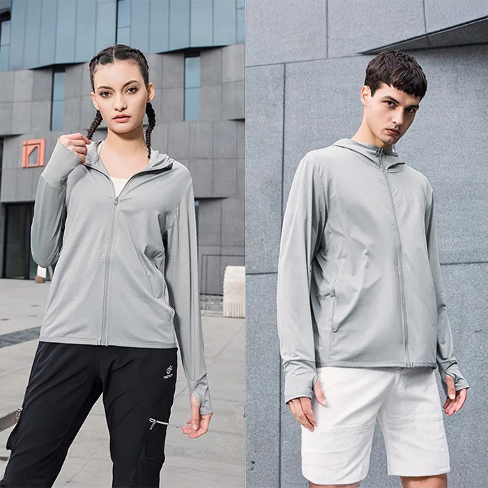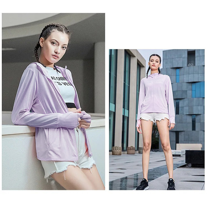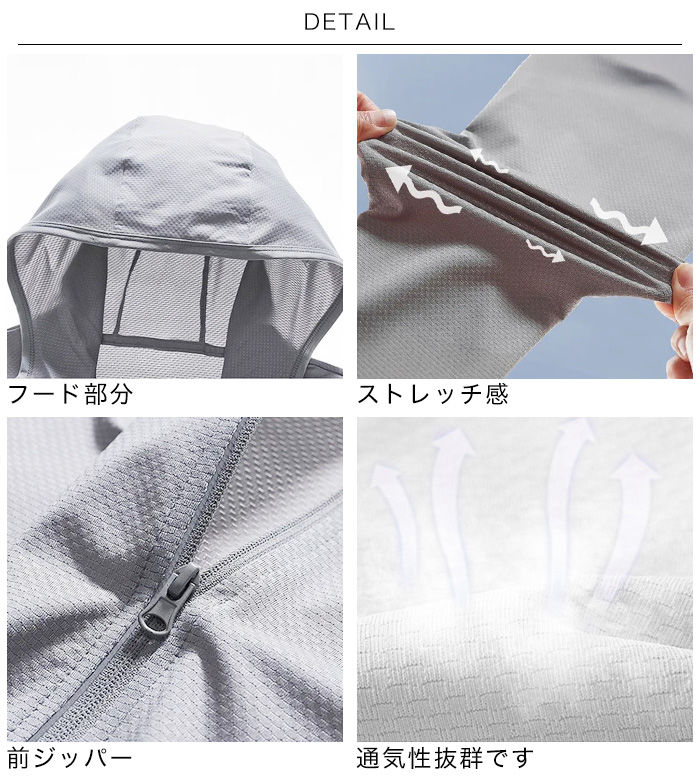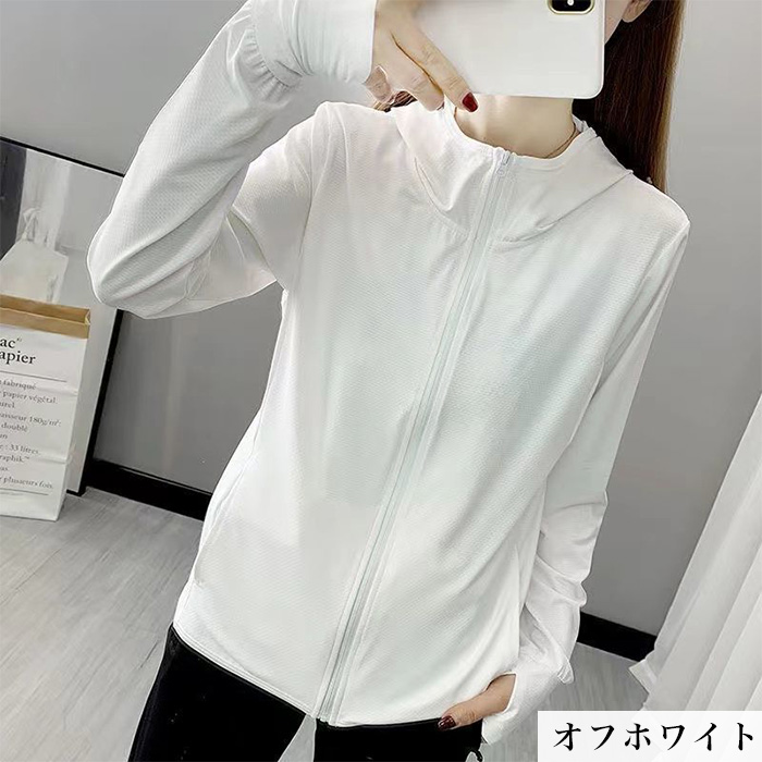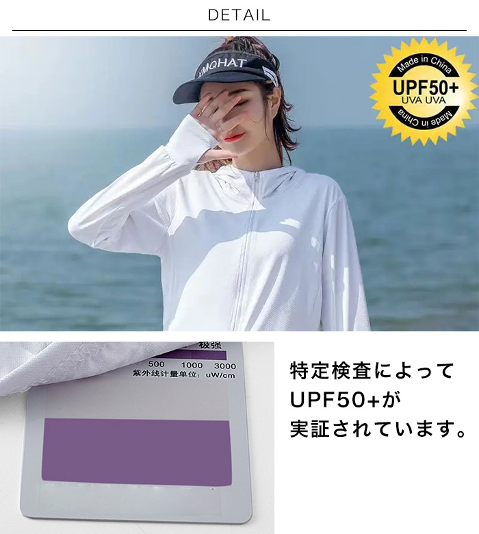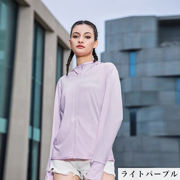 紫外線対策にSPF50+のラッシュガードパーカーをお使い下さい。おでかけ、ランニング、リゾートや旅行はもちろんオフィスや電車での冷房対策にも!軽量でバッグに入れて持ち運びも可能。指穴付きなので手の甲から日焼け対策ができます。