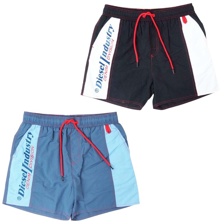 大胆なロゴプリントと切替デザインが印象的な、DIESELの水陸両用ショートパンツ。