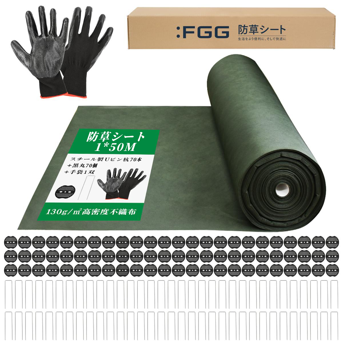 :FGG 防草シート 1m 50m 130g/m【改良版】ぼうそうしーと 超高耐久 不織布 除草シート 人口芝 砂利下 約10年 ピン70本&黒丸70枚&手袋 透水 遮光性 雑草