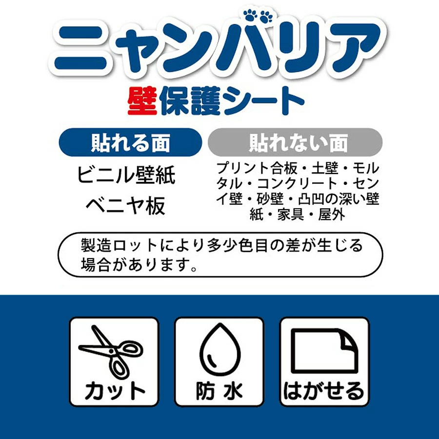 | 猫ちゃんの爪とぎ対策にぴったりな「ニャンバリア」は、壁をしっかり守る壁保護シートです。 サイズは45×100cmで、賃貸でも安心して使えるはがせるタイプ。 粘着力がありながら、簡単に貼り直しができるので、設置もラクラクです。 防水なので汚れたらサッと拭くだけでお手入れも簡単! お部屋のアクセントにもなるデザインで、猫ちゃんのひっかきから壁を守りつつ、インテリアとしても楽しめます。 お好みの大きさにカットしていただけます。 半透明のシートで壁にもなじみやすく、インテリアの邪魔にもなりにくいです! |
