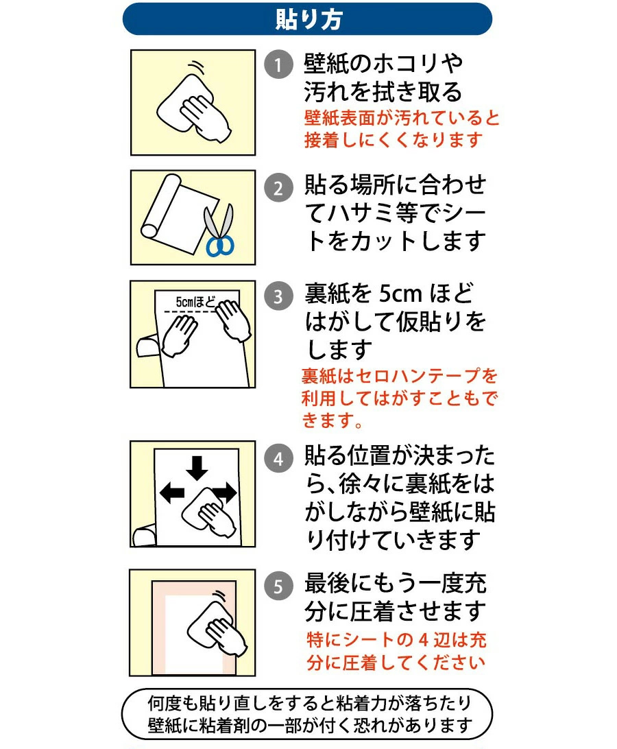 | 注意事項 | ●本シートには、はがした際壁紙を傷めないような特殊な粘着剤を使用していますが、壁紙の材質によっては壁紙表面を傷める場合がありますので、あらかじめ目立たない部分で試してからお貼りください。 ●高温・多湿の場所でのご使用は、はがれる場合がありますのでお避けください。 ●10℃以下の場所では接着しない場合があります。お部屋を暖めて(15℃〜35℃)お貼りください。 ●火に直接触れる恐れのある場所へのご使用はお避けください。 ●貼り直した際、壁紙やプリント合板の表面がはがれたり傷める場合があります。 ●不要になりました裏紙はスベリやすいのでご注意ください。 ●はがす際はゆっくりとはがしてください。 ■商品の撮影には最大限注意を払っておりますが、閲覧時のモニター環境によりましては実際の商品と若干違うお色味に映ることもございます。 |