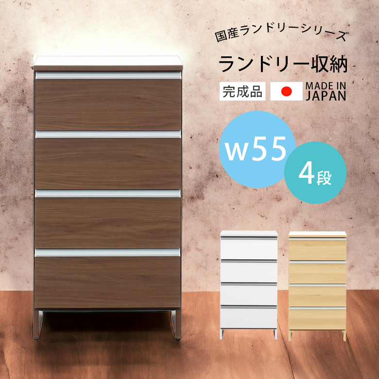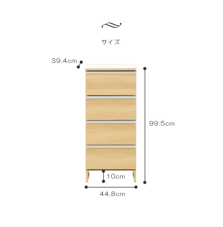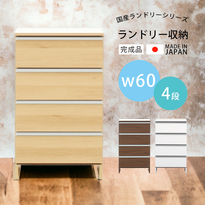 しっかりしたつくりの国産完成品。4段の引出しにたっぷり収納 出し入れスムーズなスライドレール仕様。木目の2色と艶の美しいホワイトの計3色から選べます。天板は水に強いつくり。