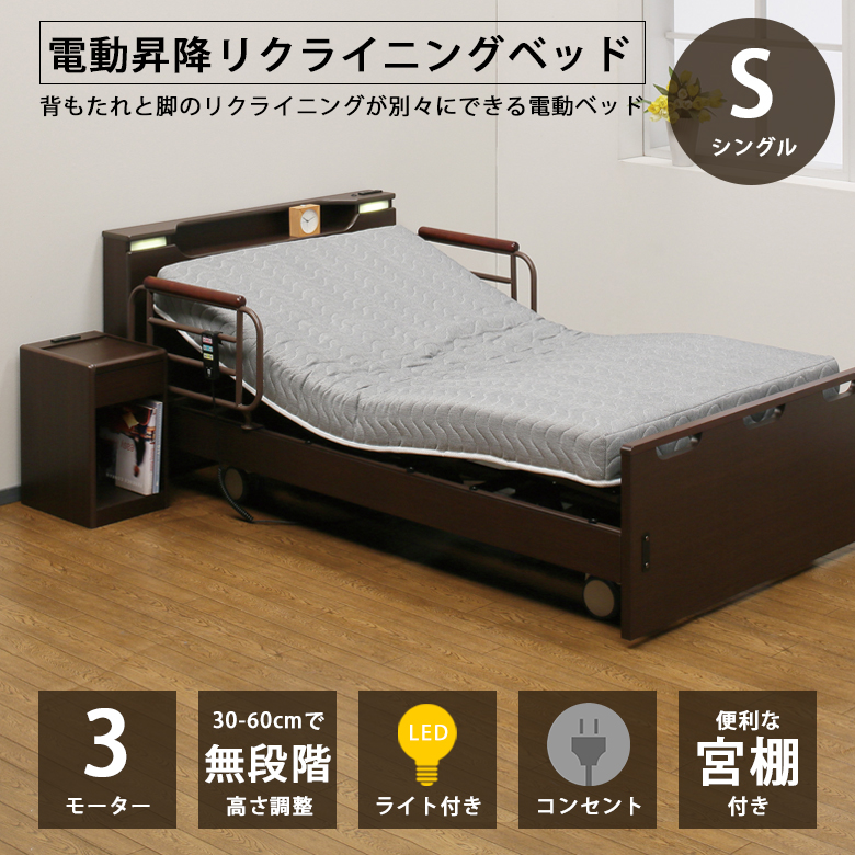 電動リクライニングベッド 3モーター 電動ベッド 介護ベッド 電動昇降 昇降機能付き LED照明 コンセント シングルサイズ