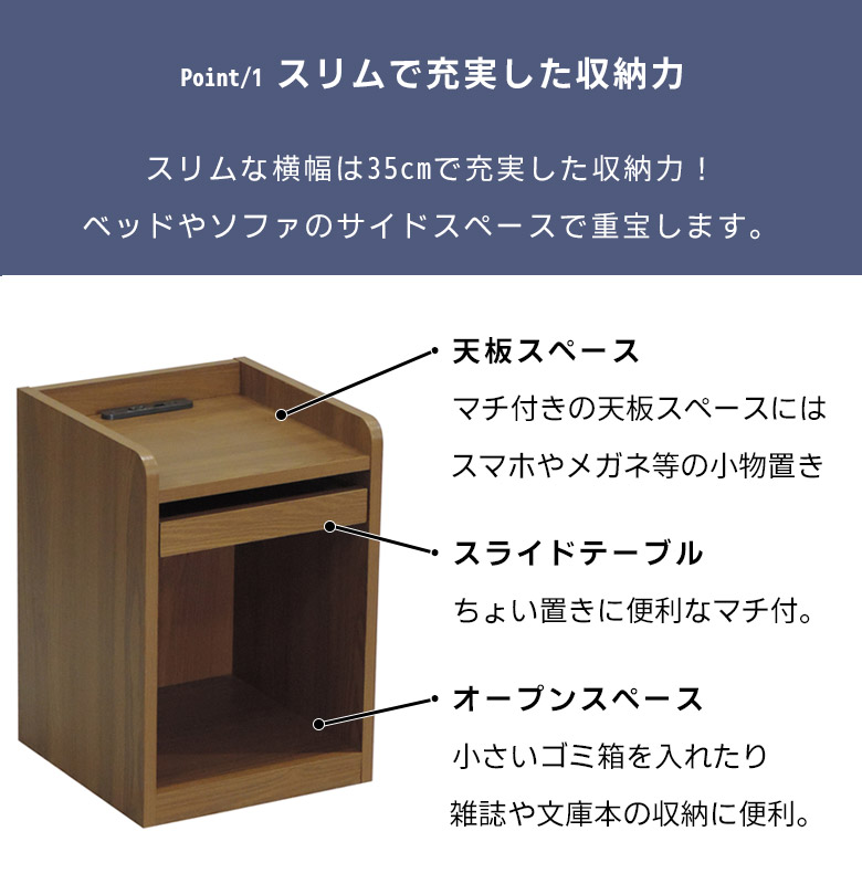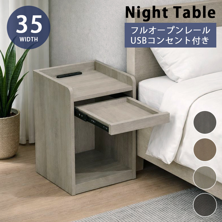 ナイトテーブル サイドテーブル コンセント 木製 収納 オープン収納 スリム スライドテーブル フルオープンレール 幅35cm コンパクト ベッドサイド
