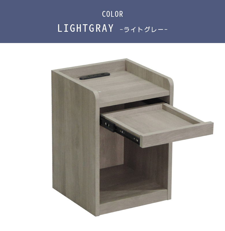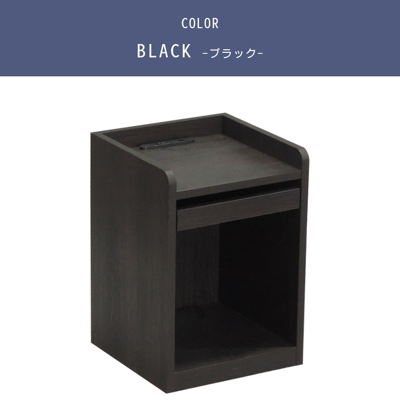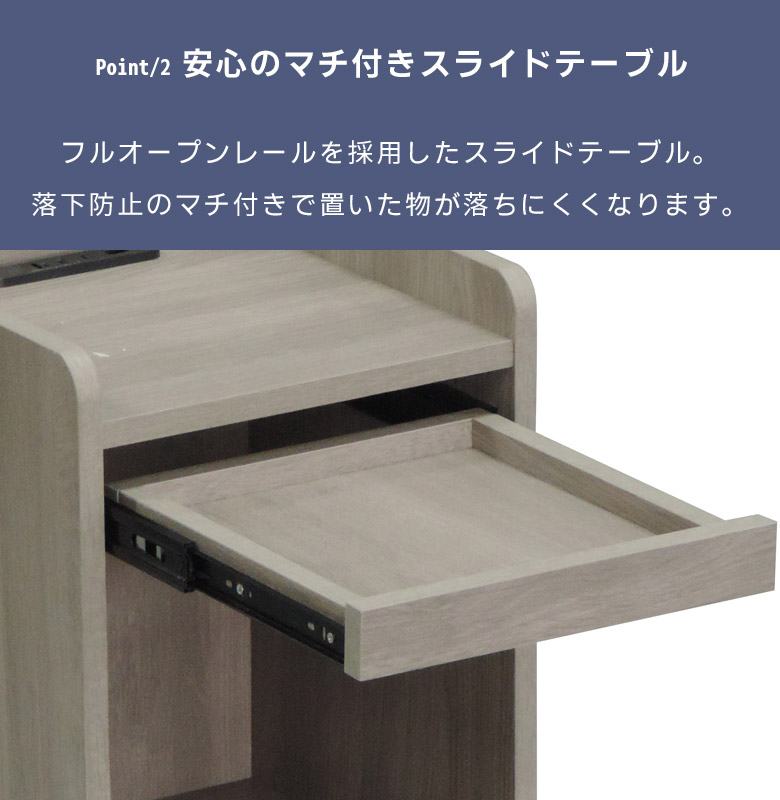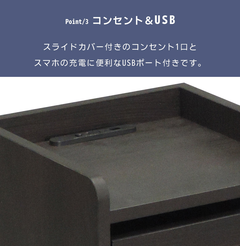 ベッドサイドに置いて便利なナイトテーブル スライドテーブル付きでちょい置きに便利 オープンスペースには雑誌や文庫本の収納に便利 携帯の充電などに使える便利なコンセント付き