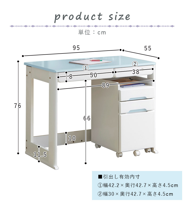 デスク:幅95cmx奥行き55cmx高さ76cm