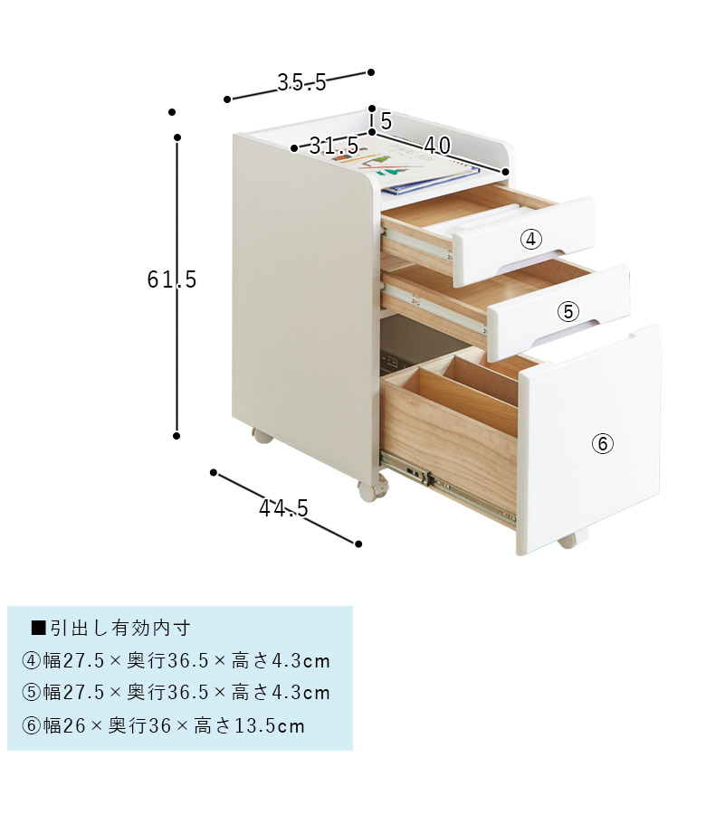 ワゴン:幅35.5cmx奥行き44.5cmx高さ61.5cm