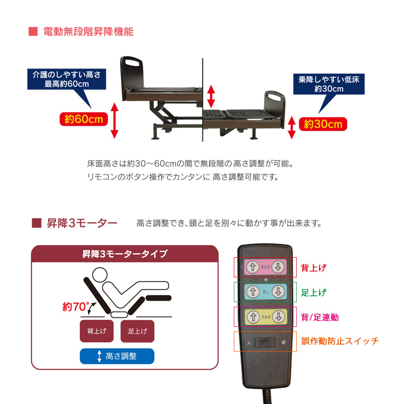 電動ベッド 3モーター 介護ベッド 電動昇降 昇降機能付き