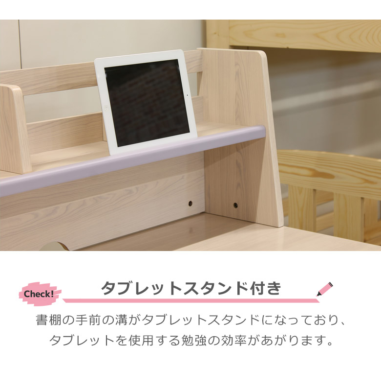 書棚の手前の溝がタブレットスタンドになっており、タブレットを使用する勉強の効率が上がります。