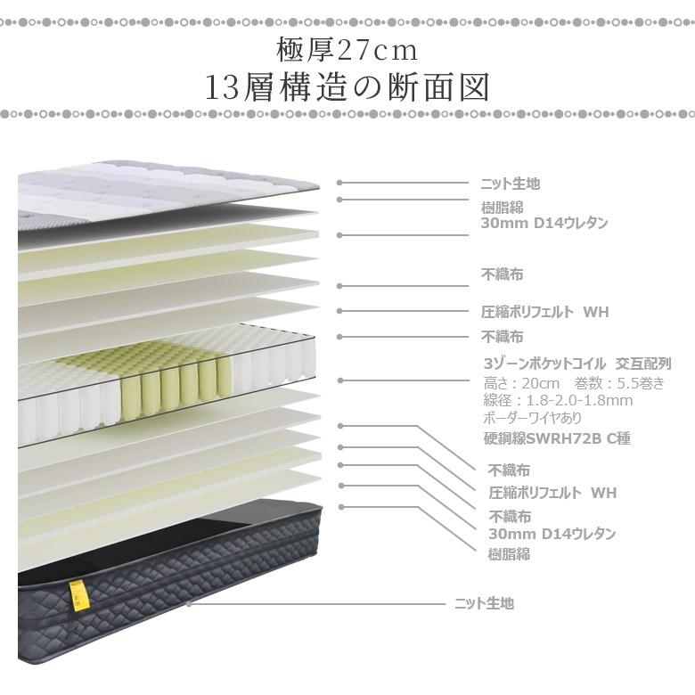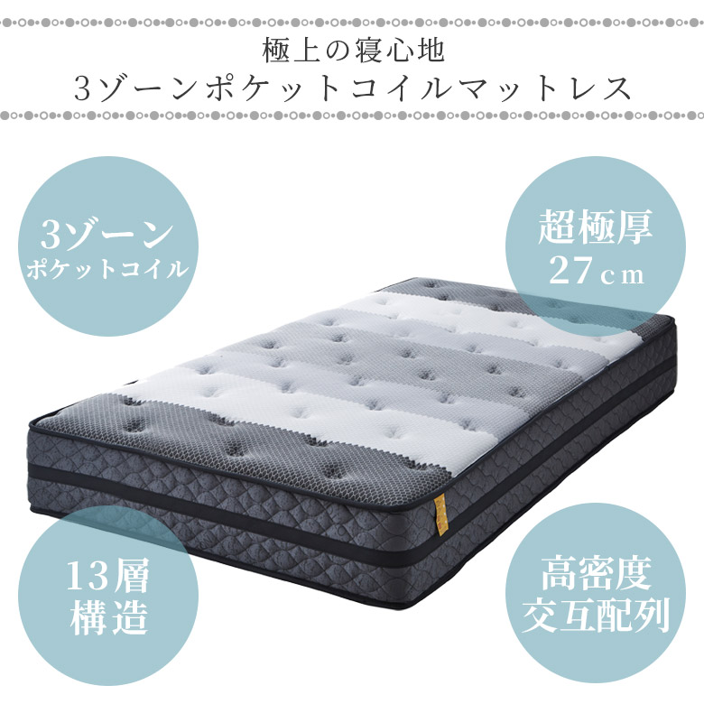マットレス ダブル ポケットコイル ダブルサイズ 3ゾーン 高反発 マット 厚さ27cm スプリングマットレス