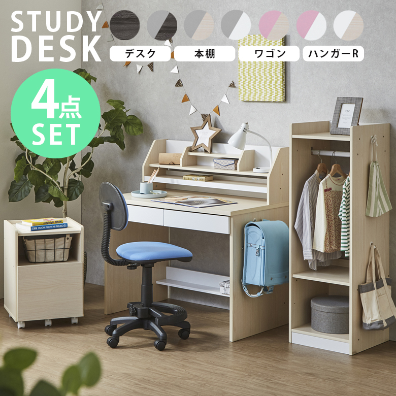 学習机 4点セット 勉強机 学習デスク ハンガーラック 収納 引出し付き デスクセット セット コンパクト 木製 子供 子供用 子供部屋 足元収納