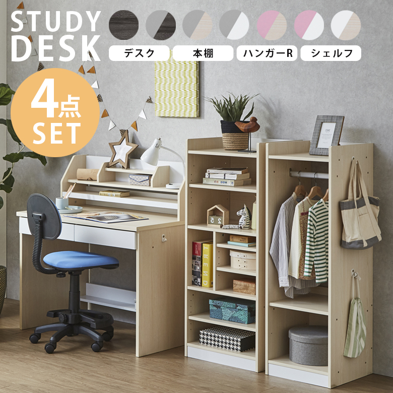 学習机 勉強机 デスクセット ハンガーラック 引出し付き シェルフ 4点セット 収納 学習デスク セット コンパクト 木製 子供 子供用 子供部屋