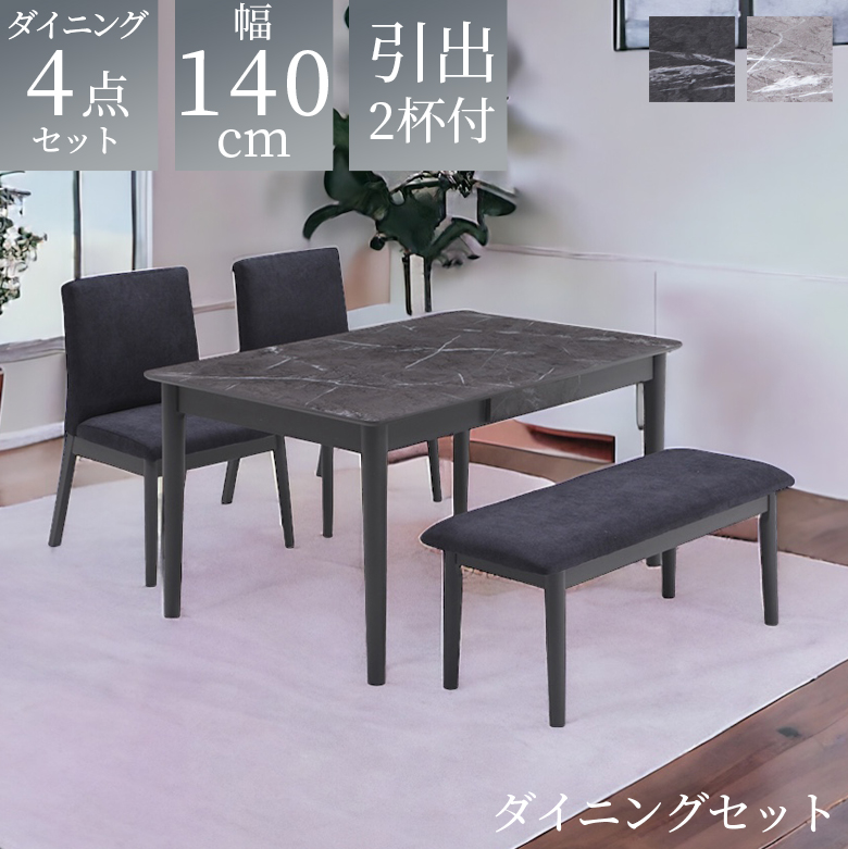 ダイニングテーブルセット 4点セット 幅140 収納付き 引出し付き 2杯 テーブル 140cm 4人掛け チェア2脚 ダイニング ベンチ 石目調