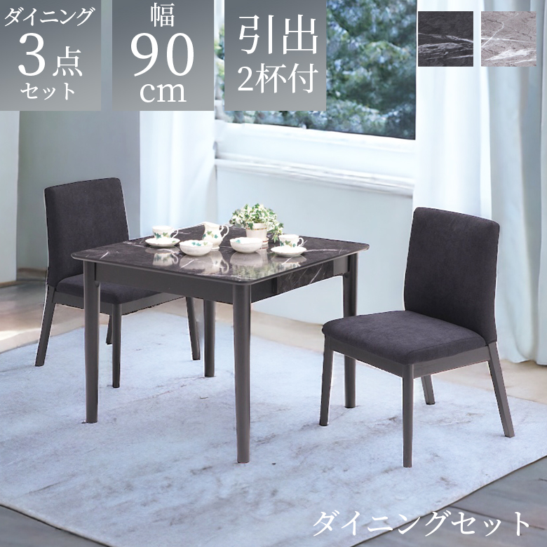 ダイニングテーブルセット 3点セット 2人掛け 90cm 正方形 引出し付き 2杯 テーブル チェア2脚 ダイニングセット 石目調