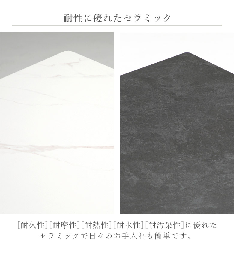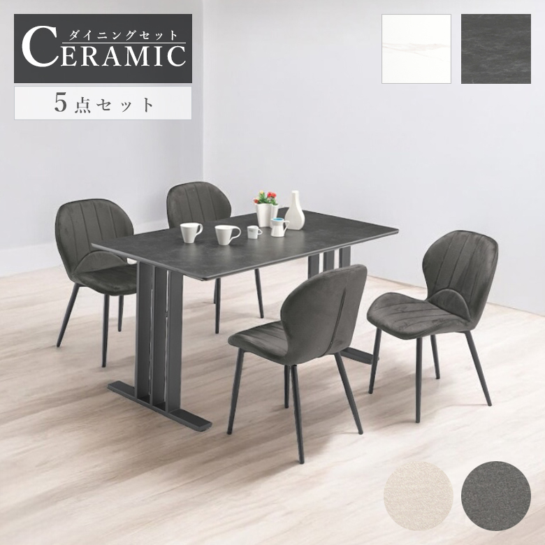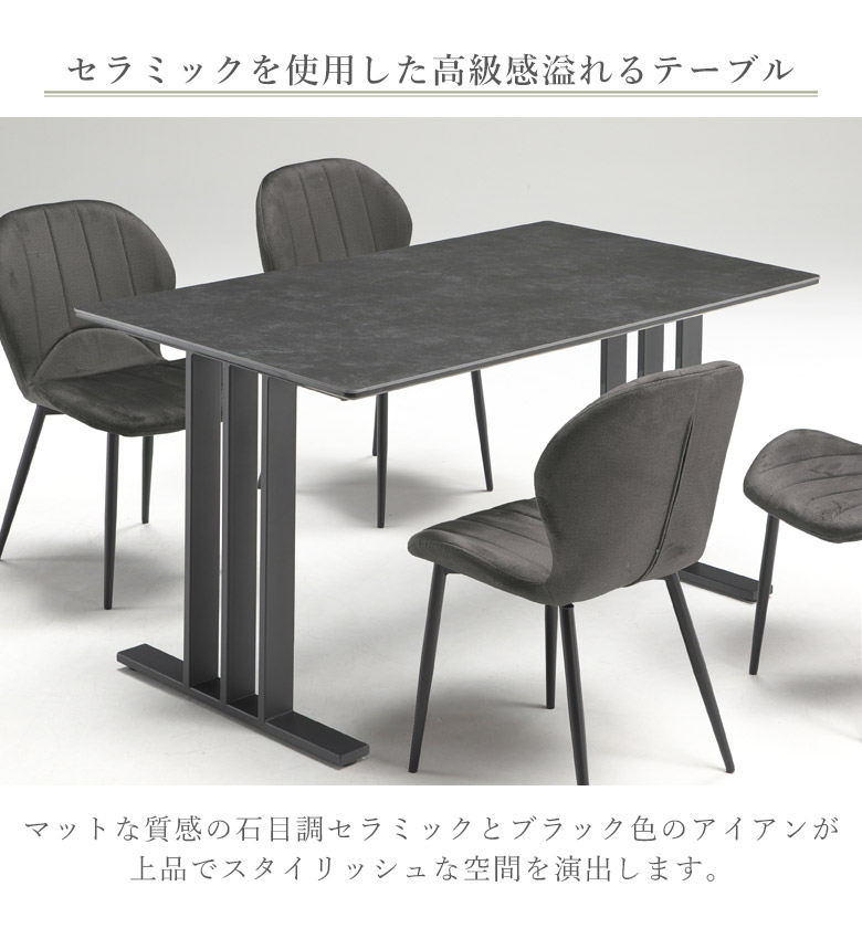 セラミックを使用した高級感あふれるダイニングテーブルと異素材の組み合わせがモダンなチェアの5点セット 肌触りの良い高級感あふれるファブリック生地のチェア 脚はアイアン脚を使用