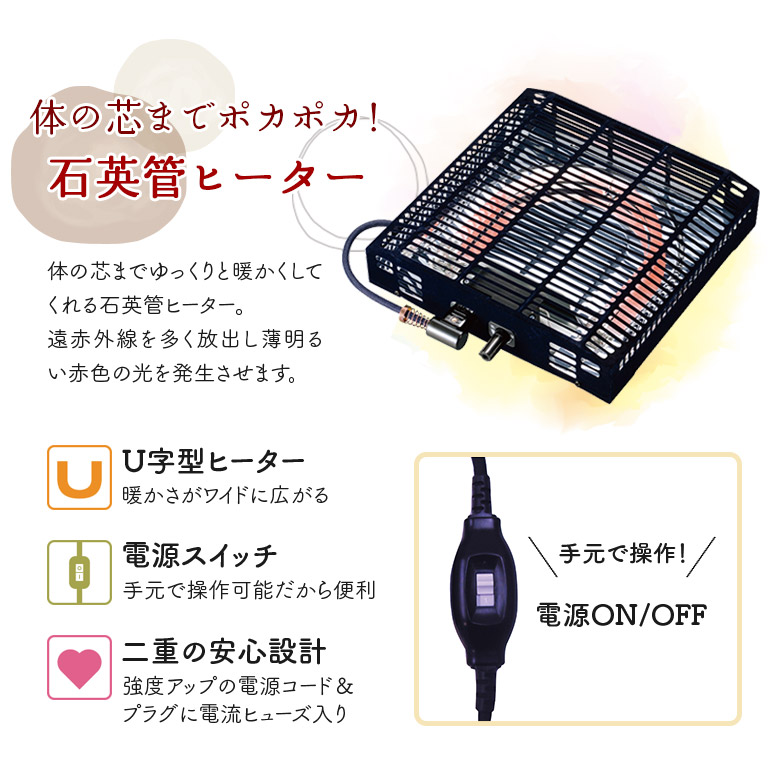 ふんわり温かい石英管ヒーター使用。
