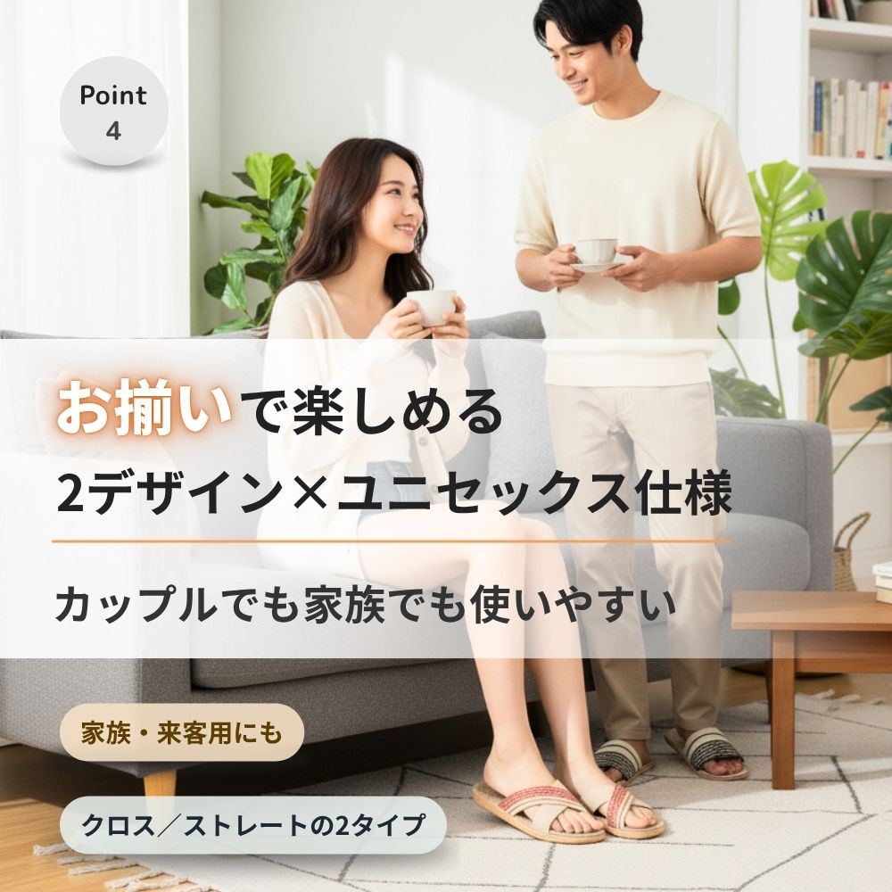 男女兼用デザイン&幅広いサイズ展開で、ペア使いや来客用にもおすすめです。