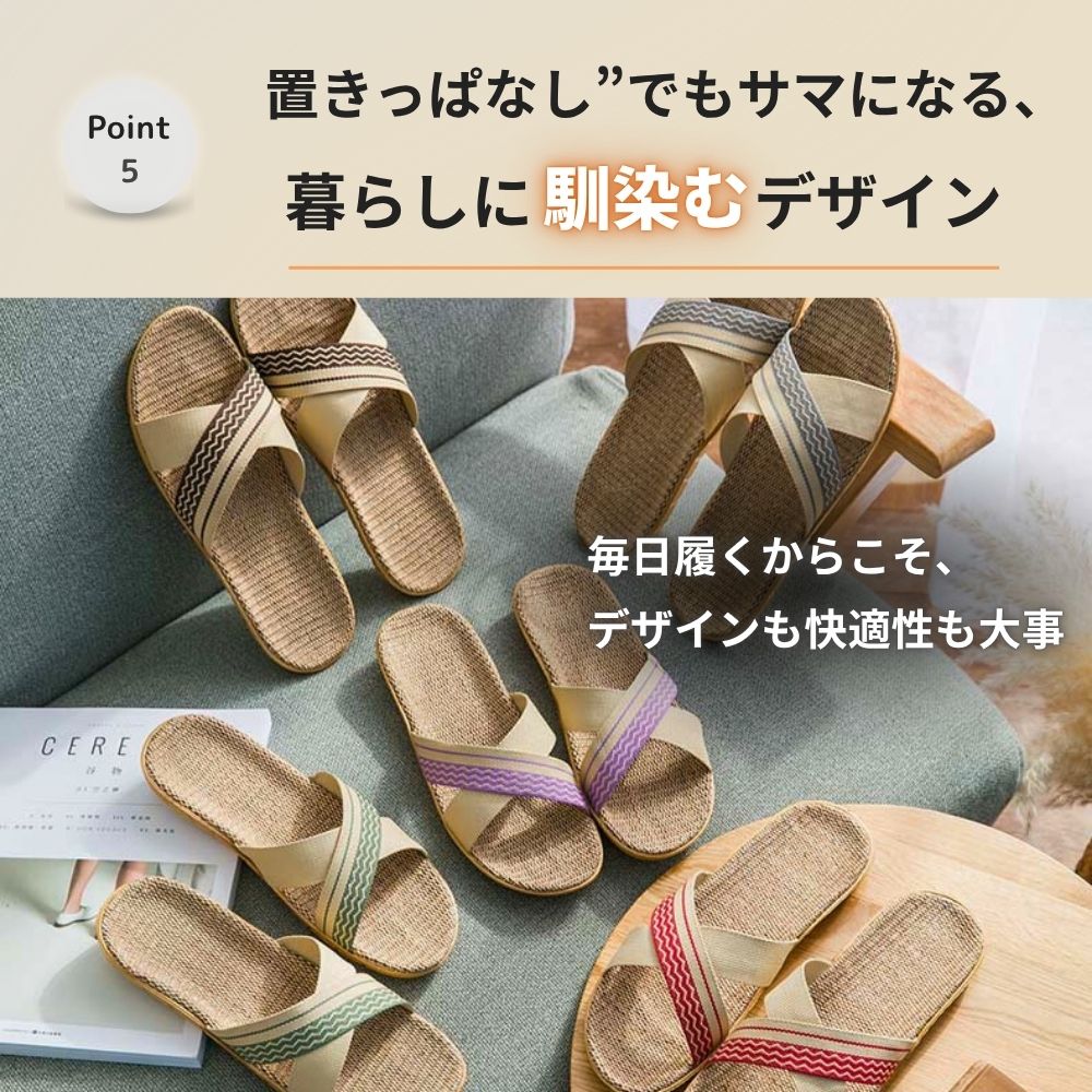 シンプルでナチュラルな見た目は、室内履きはもちろん、ベランダやちょっとした外履きにも最適。