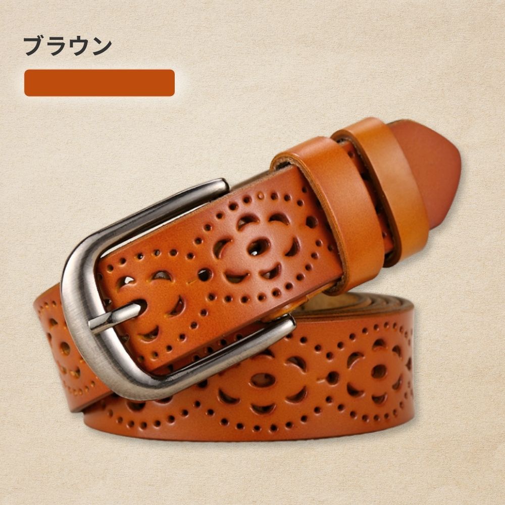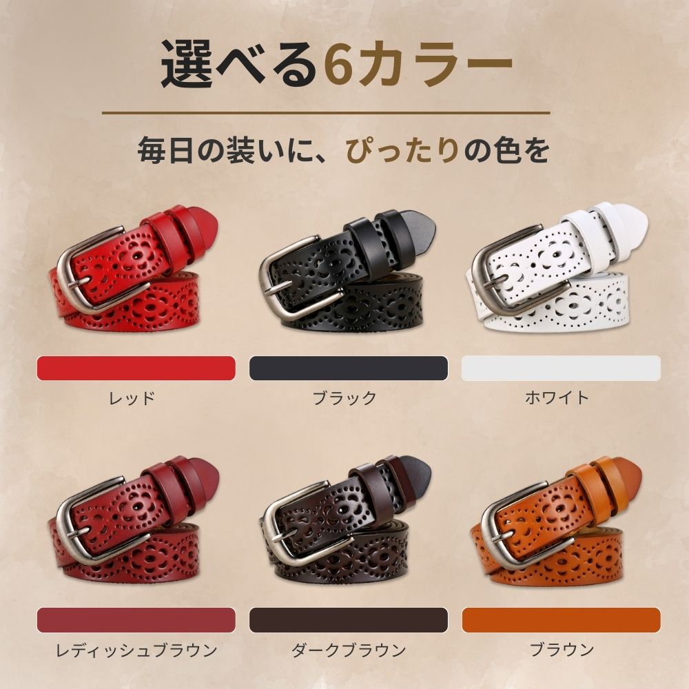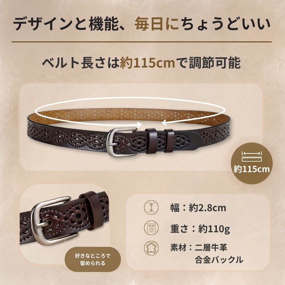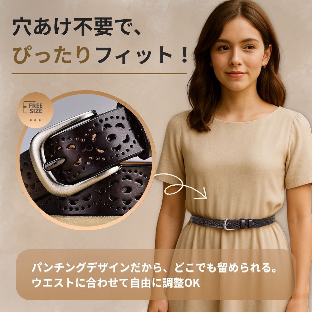 ベルト全体に施された花模様の穴あきデザインにより、どこでも自由に留められます。ベルト穴を新たに開ける必要がなく、ウエストにぴったりフィットします。