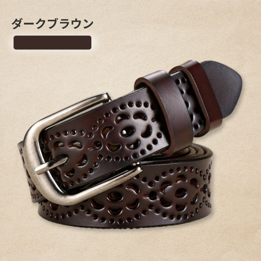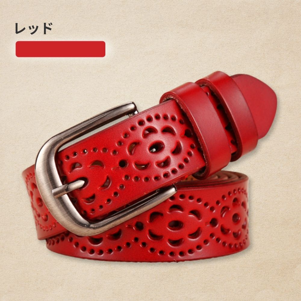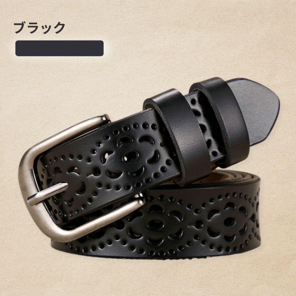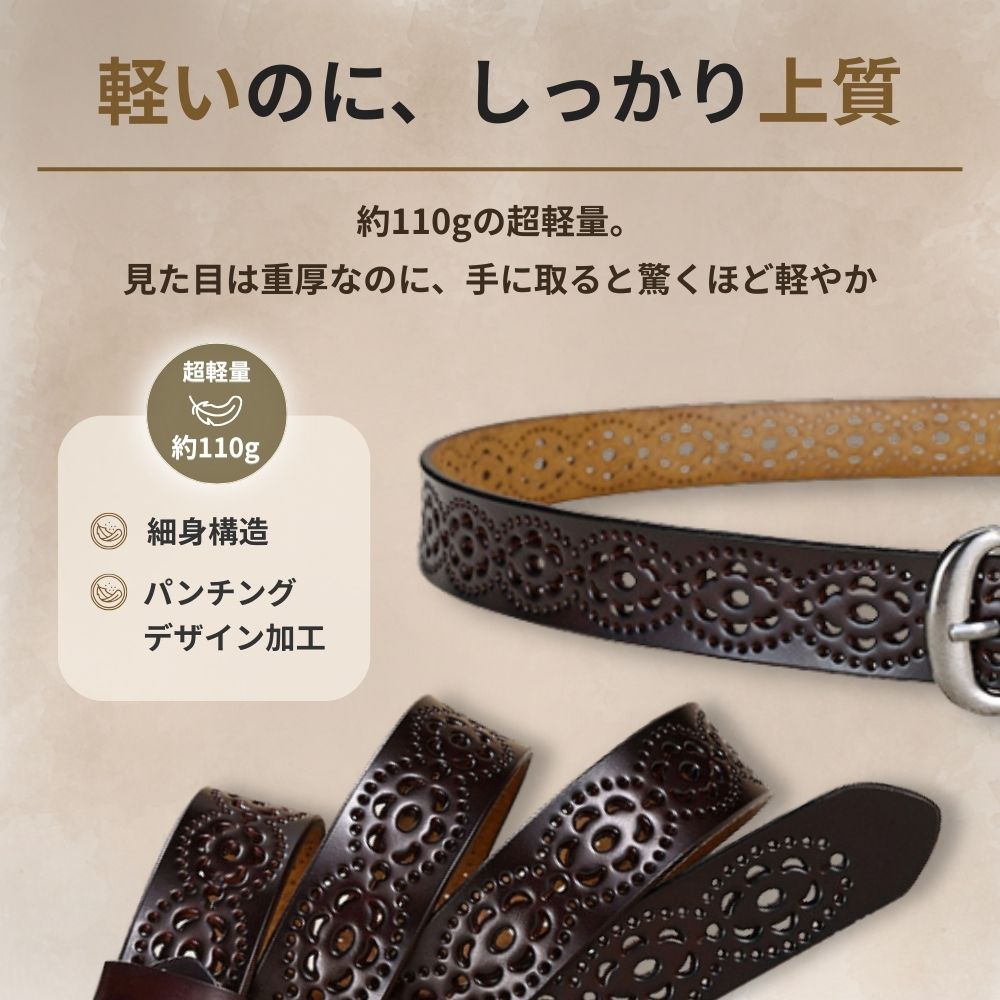 ベルト全体に施された花模様の穴あきデザインにより、どこでも自由に留められます。ベルト穴を新たに開ける必要がなく、ウエストにぴったりフィットします。
