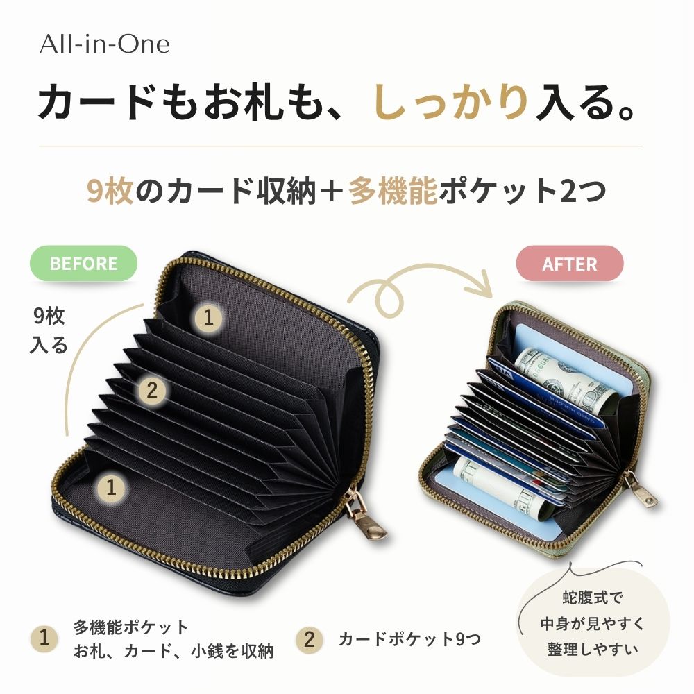 9つのカードポケット+多機能ポケット付きで、カードや小銭、お札までしっかり収納。