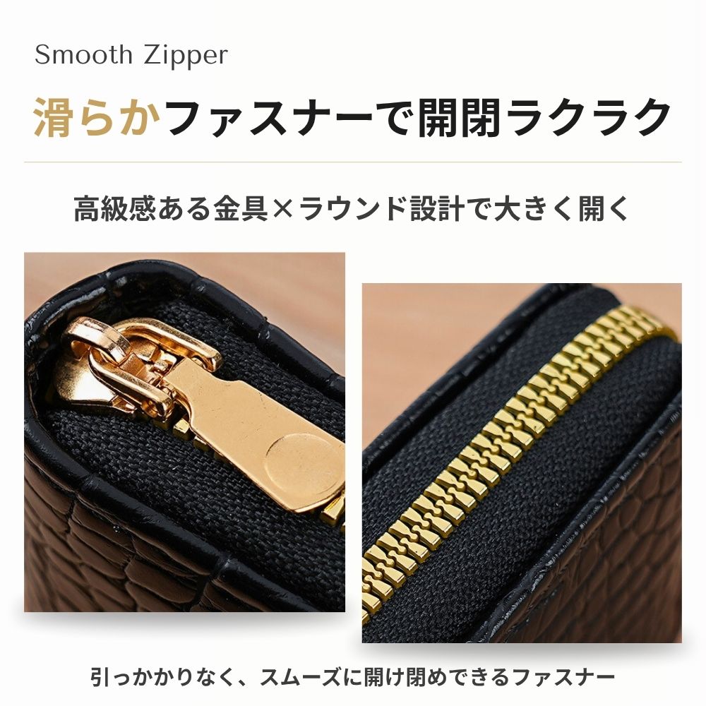 大きく開いて中身が見やすいラウンドファスナータイプ。