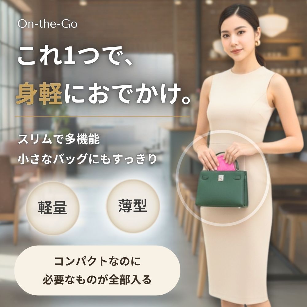厚さ約2.3cmのスリム設計で、ポケットやミニバッグにもすっきり収まります。