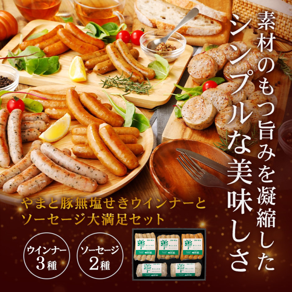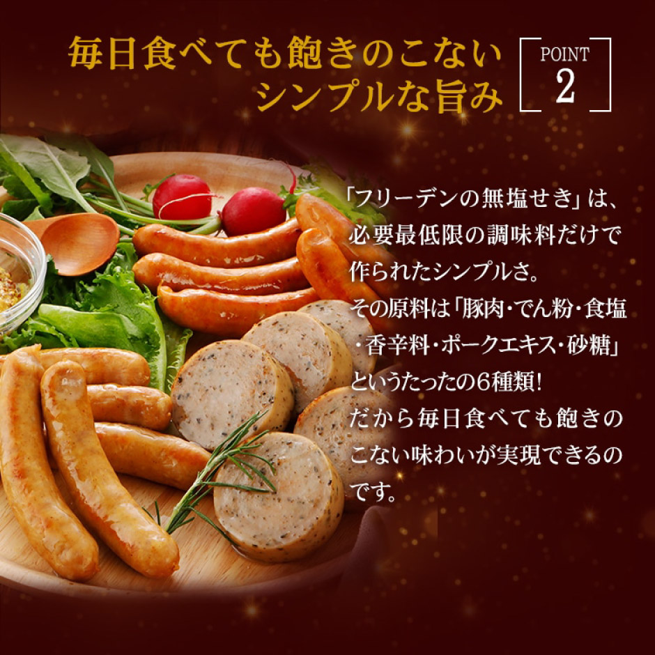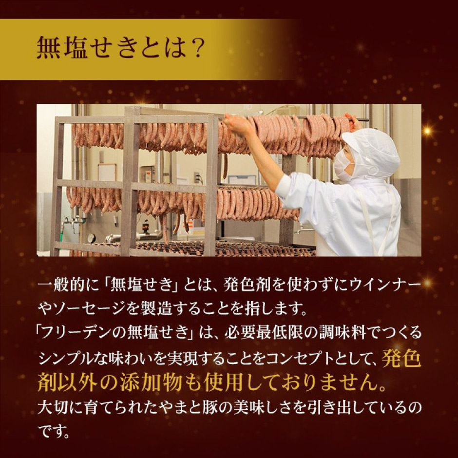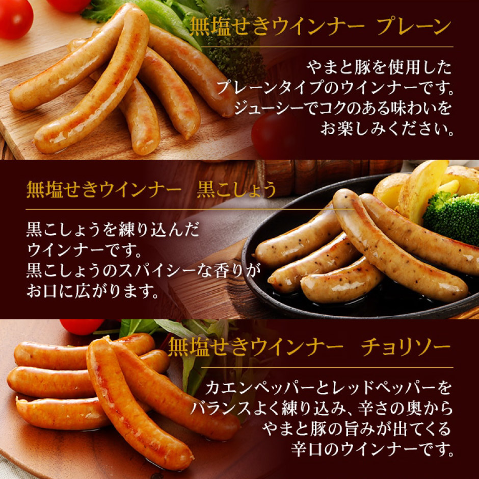 | 原材料 | 【無えんせきウインナー】豚肉(国産)、でん粉、食塩、ポークエキス、香辛料、砂糖、(一部に豚肉を含む) 【無えんせき黒こしょうウインナー】豚肉(国産)、でん粉、食塩、香辛料、ポークエキス、砂糖、(一部に豚肉を含む) 【無えんせきチョリソー】豚肉(国産)、でん粉、食塩、香辛料、ポークエキス、砂糖、(一部に豚肉を含む) 【無塩せきブラックペッパーソーセージ】豚肉(国産)、でん粉、食塩、香辛料、ポークエキス、砂糖、(一部に豚肉を含む) 【無えんせきハーブソーセージ】豚肉(国産)、でん粉、食塩、香辛料、ポークエキス、砂糖、(一部に豚肉を含む) |