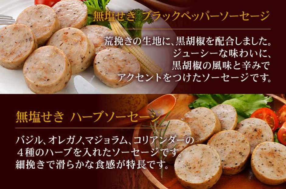 | 内容量 | 【無えんせきウインナー・無えんせき黒こしょうウインナー・無えんせきチョリソー】各100g 【無塩せきブラックペッパーソーセージ・無えんせきハーブソーセージ】各170g |