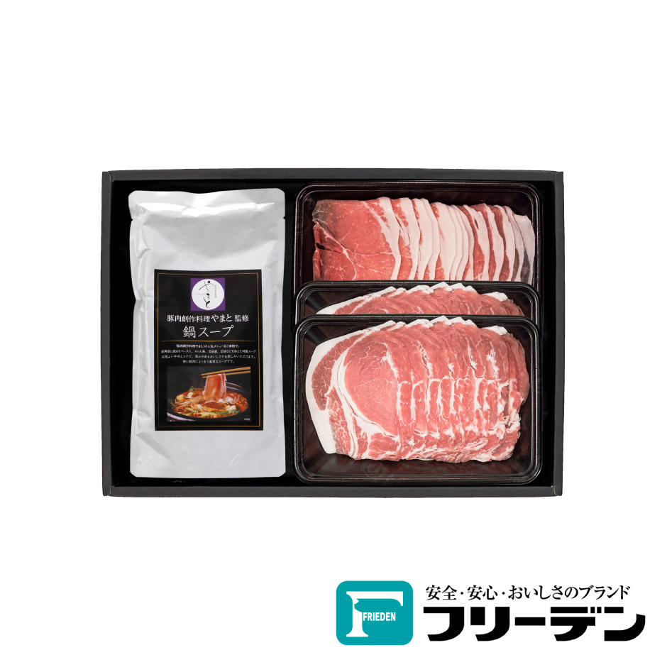 | 内容量 | 【豚ロースしゃぶしゃぶ用・豚モモしゃぶしゃぶ用】200g/パック 【豚肉創作料理やまと監修鍋スープ】700g/袋 |