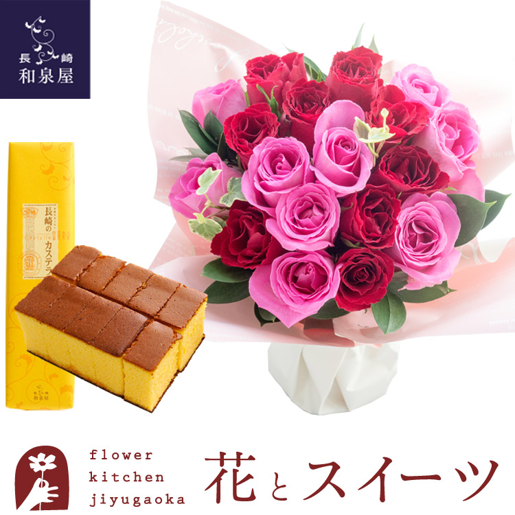 花とスイーツのセット 18本バラスタンディングブーケと長崎カステラ蜂蜜 0.5号 10切入 ギフトセット お祝い 花 即日発送 FKAA