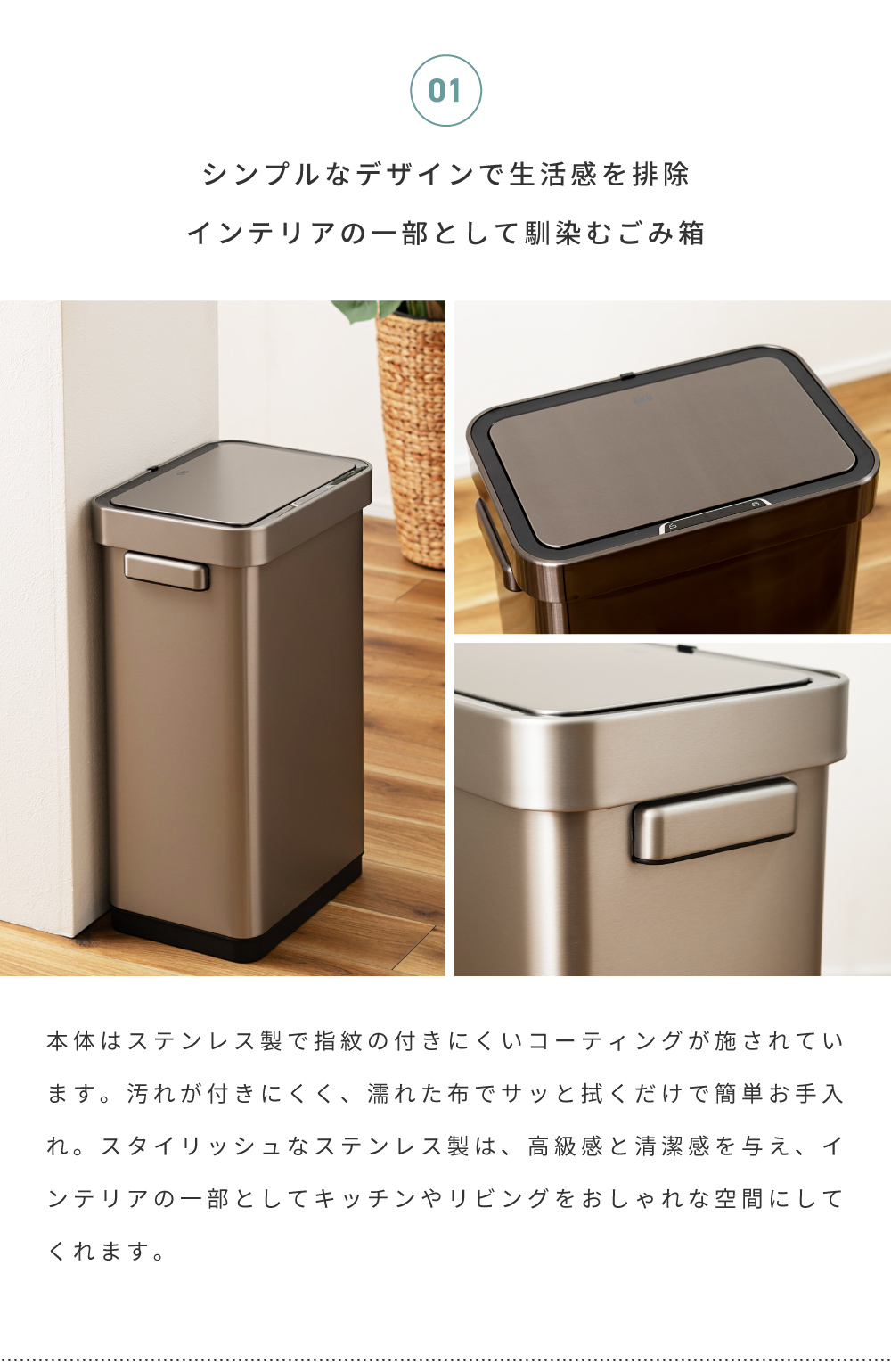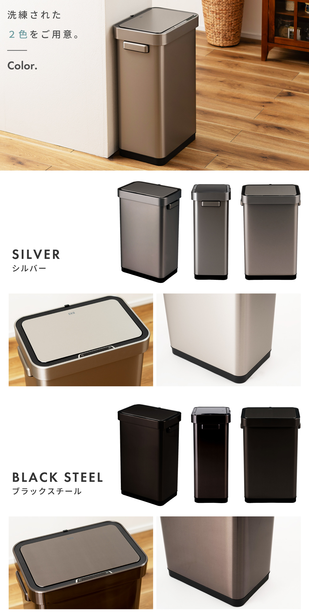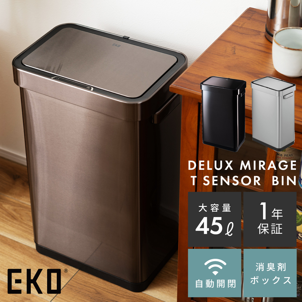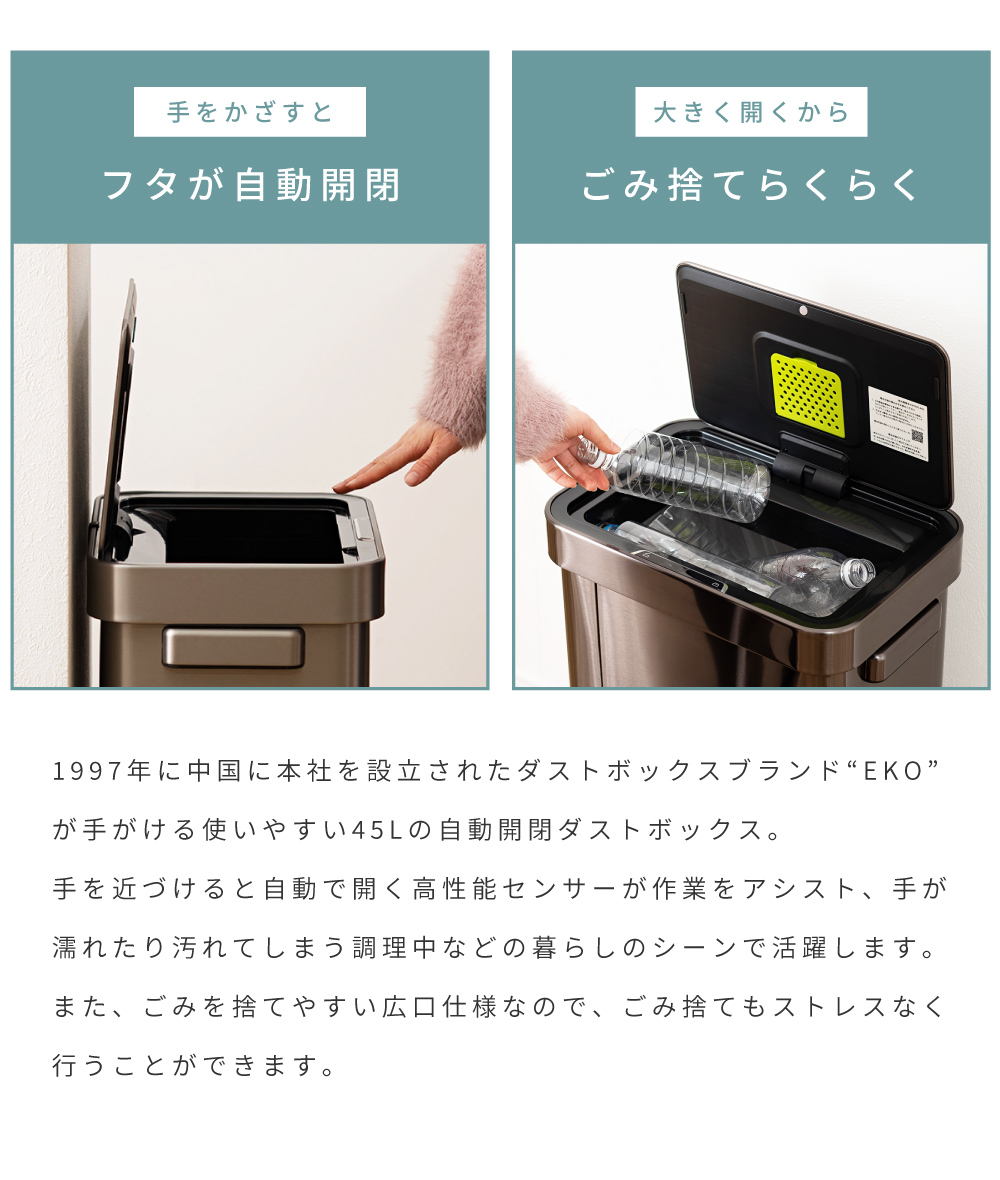 ゴミ箱 45L センサー ソフトクローズ EKO 自動開閉 ダストボックス ごみ箱 電池式 シンプル おしゃれ 高性能センサー タッチパネル 静音 大容量 ブラック シルバー スチール インダストリアル 黒 キッチン シンプル