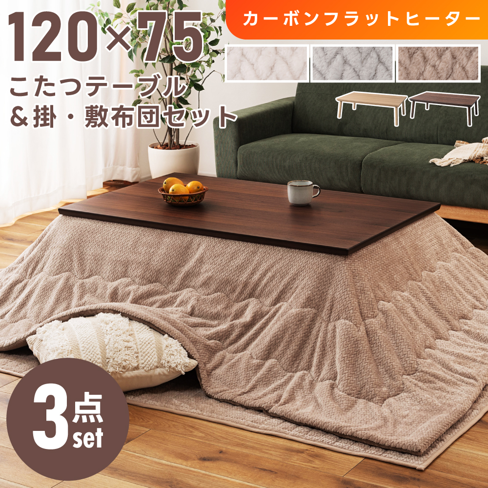 こたつセット 3点 こたつテーブル 120×75 こたつ布団 ラグ 床暖 ホットカーペット 長方形 フランネル ニット柄 手元コントローラー 木製 木目 おしゃれ 茶色 家族 リビング オールシーズン フラットヒーター コタツ かわいい 白 ブラウン ナチュラル 遠赤外線 日本製 食卓